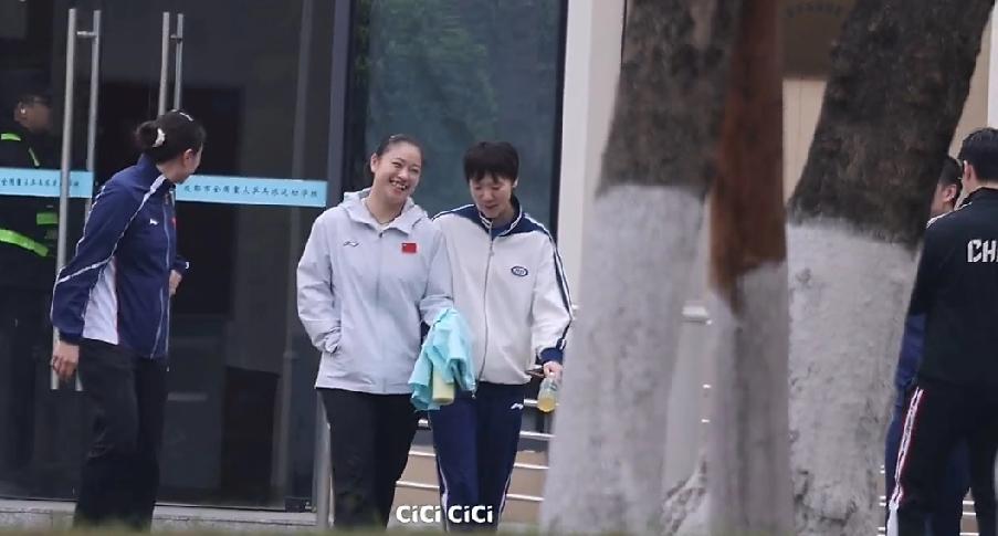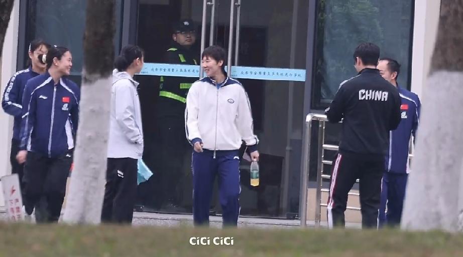 成都国乒训练基地,今天下午看完队友打伦敦团体世乒赛参赛资格队内选拔赛的王曼昱,和徐奕、白思文以及任浩教练、孟队医一起开开心心走出训练馆。 大家都没有背包,没带训练工具,应该就是专门看队内选拔赛的,曼昱有手里拿着一瓶功能饮料,可能也抽空做了些体能上的训练。今天也该稍微放松一下,接下来还有4天训练时间,国乒据说26号就启程前往澳门提前备战澳门世界杯比赛。曼昱加油!