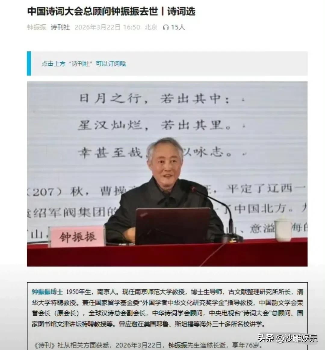 今天文娱圈传来令人悲痛的消息! 3月22日,就在这个原本平静的周末,一则消息让文化圈震颤不已。《中国诗词大会》总顾问、南京师范大学教授钟振振先生因病辞世,享年76岁。 很多人认识他,是因为电视屏幕上那个总能把晦涩典故讲得妙趣横生的老先生。但鲜少有人知道,这位被观众亲切称为“诗词活字典”的学者,背后还有一段堪称传奇的学术人生。 1950年生于南京的钟振振,打小浸在诗词墨香里。他的外祖父施肖丞是章太炎弟子,给外孙取名“振振”,取自《诗经》“振振公子”,意为仁厚诚实。 1968年,18岁的钟振振下乡插队,只有初中学历的他,在田埂上依然手不释卷。十年后,高考恢复,他做了一件让所有人震惊的事——以初中学历直接报考研究生,且一举成为词学大师唐圭璋先生的首位博士弟子。 在南师读书时,室友杨海明半夜醒来,总看见钟振振还端坐桌前,通读《全唐诗》——不是一遍,是三遍。 钟振振的厉害,不在于写了多少学术论文,而在于他让诗词走出了象牙塔。 作为《中国诗词大会》总顾问,他曾直言:节目初期太偏重背诵,这不是他想要的。他建议开设“无情对”“接句游戏”,甚至让观众自己创作下句。一句“江山代有才人出,我辈登临正少年”,就是这么玩出来的。 他的脚步还遍布耶鲁、斯坦福等30多所海外名校,把中国诗词的美带到了全世界。 有网友感慨:“以前觉得诗词是高不可攀的东西,看了钟老的讲解,才发现原来李白杜甫也这么接地气。” 说实话,钟振振的离去,让我想起一个老生常谈的话题:我们到底是在消费诗词,还是在传承诗词? 钟老生前有个观点很扎心:现在写旧体诗词的人有500万,每天能产出8万首诗,相当于一天就是一部《全唐诗》。但数量是上去了,质量呢? 他自己也承认,大部分作品“一般般”,但他依然鼓励大家写,因为“创作需要大胆,要想写、敢写”。 可问题是,在这个追求速成的时代,还有多少人愿意像钟老那样,为一个典故翻遍两唐书,花三年时间去考证? 钟振振曾自嘲,名字常被读成“振振有词”的“振振”,那就从俗吧。如今回头看,这一生,他确实做到了“振振有词”——用最平实的话,讲最深沉的诗。 先生走了,但那些被他点亮的诗词之光,会一直亮着。 这大概就是文化传承的意义。