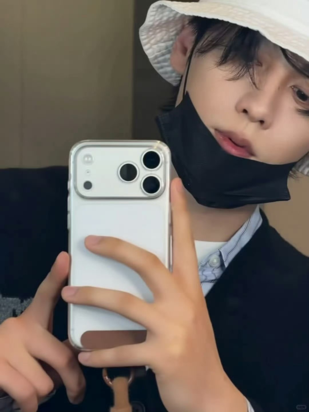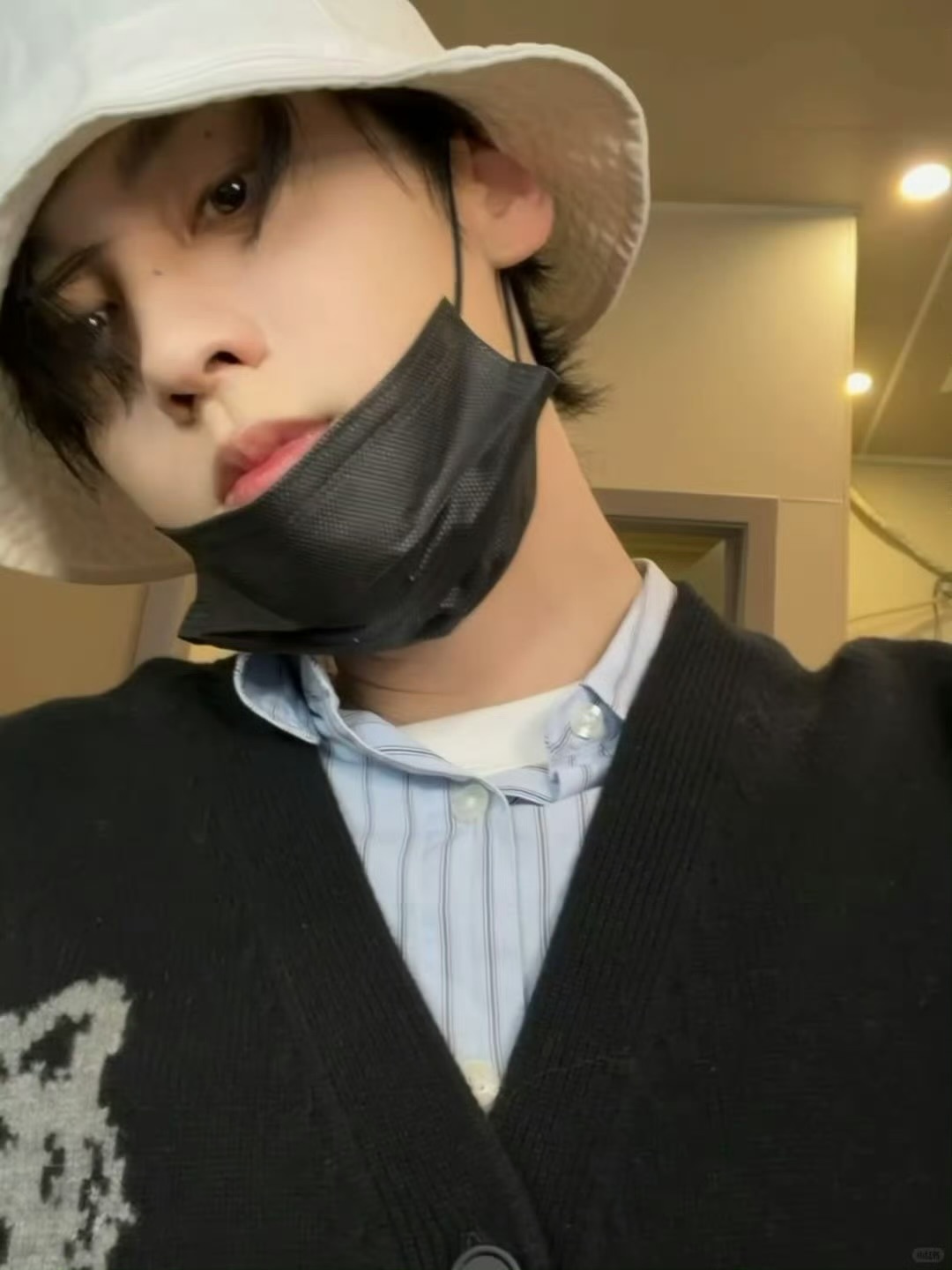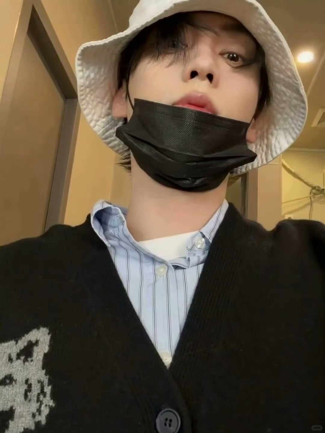 田栩宁|今日份营业自拍,黑色针织开衫配浅蓝色条纹衬衫,清爽男大穿搭,帅哥露脸就是王炸!