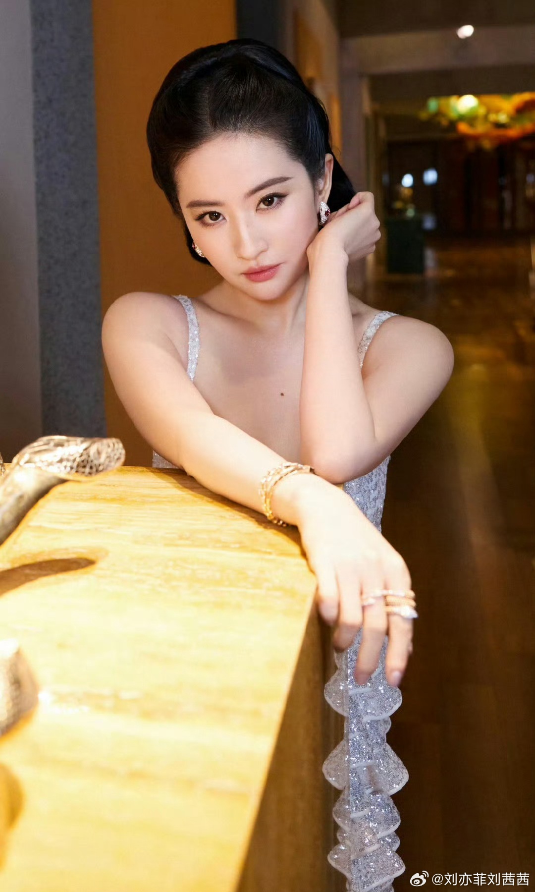 身处高端珠宝展览现场,暖调木质柜台与玻璃展柜环绕,暖黄灯光与艺术展陈碰撞出奢雅氛围,与刘亦菲的闪耀造型完美契合。