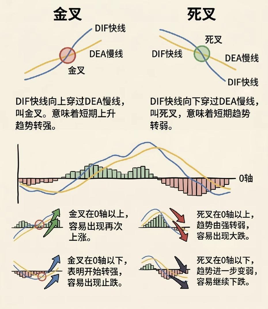 在股市里,MACD被称为“指标之王”,可绝大多数散户只用金叉死叉,结果不是买在半山腰,就是卖在起涨点,反复被市场收割。 今天给大家分享一套实战多年的MACD进阶策略,简单易懂、胜率更高,新手也能快速上手。 记住核心原则:0轴定趋势,背离定转折,柱线定动能,只做顺势,不做逆势。 0轴上方代表多头趋势,是操作的黄金区域。股价回踩时,MACD快线回踩慢线不跌破0轴,绿柱翻红、伴随缩量回调,就是稳健的低吸点。 底背离是抄底的关键信号:股价创新低,但MACD指标不创新低、绿柱持续缩短,等待金叉确认后再入场,避开盲目抄底的飞刀。 空中加油形态更是抓主升浪的利器:0轴上短暂死叉后快速金叉,红柱二次放大,往往是趋势加速的信号。 而顶背离则是逃顶信号,股价创新高、指标却走弱,红柱不断缩短,一定要及时减仓落袋为安。 最后提醒,指标只是辅助工具,严格止损、顺势而为才是长久盈利的核心。不做横盘震荡的无效信号,不追高位放量的诱多行情,守住纪律,才能在股市走得更远。 投资有风险,入市需谨慎,以上内容仅为知识分享,不构成任何投资建议。 股市MACD macd抄底