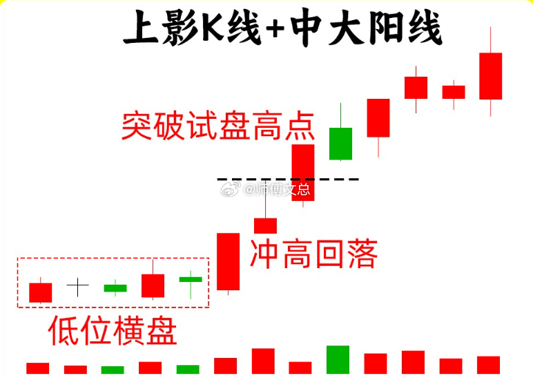二、上影 K 线 + 中大阳线这种形态一般是股价低位或是上涨趋势的初期出现,首先是在分时图里股价出现放量拉升,形成冲击波,上涨幅度一般会在7%左右,但是并没有出现涨停,随后股价开始自由下落,形成一个长上影线的K线。上涨放量、下跌缩量。这是主力向上试盘的动作,测试上方的抛压情况。次日股价出现一个中大阳线,收盘价格突破长上影线的最高价,说明主力试盘成功,如果并没有出现阳线,那就说明主力试盘失败