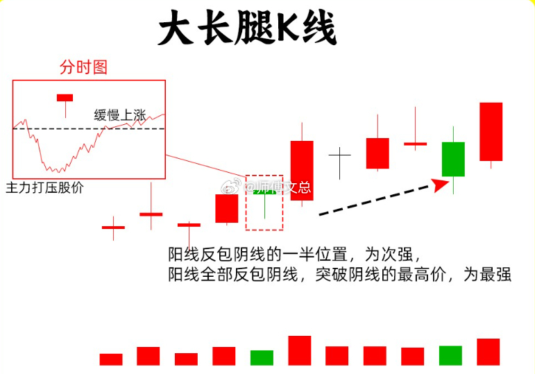 四、大长腿 K 线这个形态上上影K形态,正好想法,他 是向下走,检测下方的承接力量。随后能有效拉回,在分时图里,形态V型的一个反转,在日K线里就形成了长下影线。