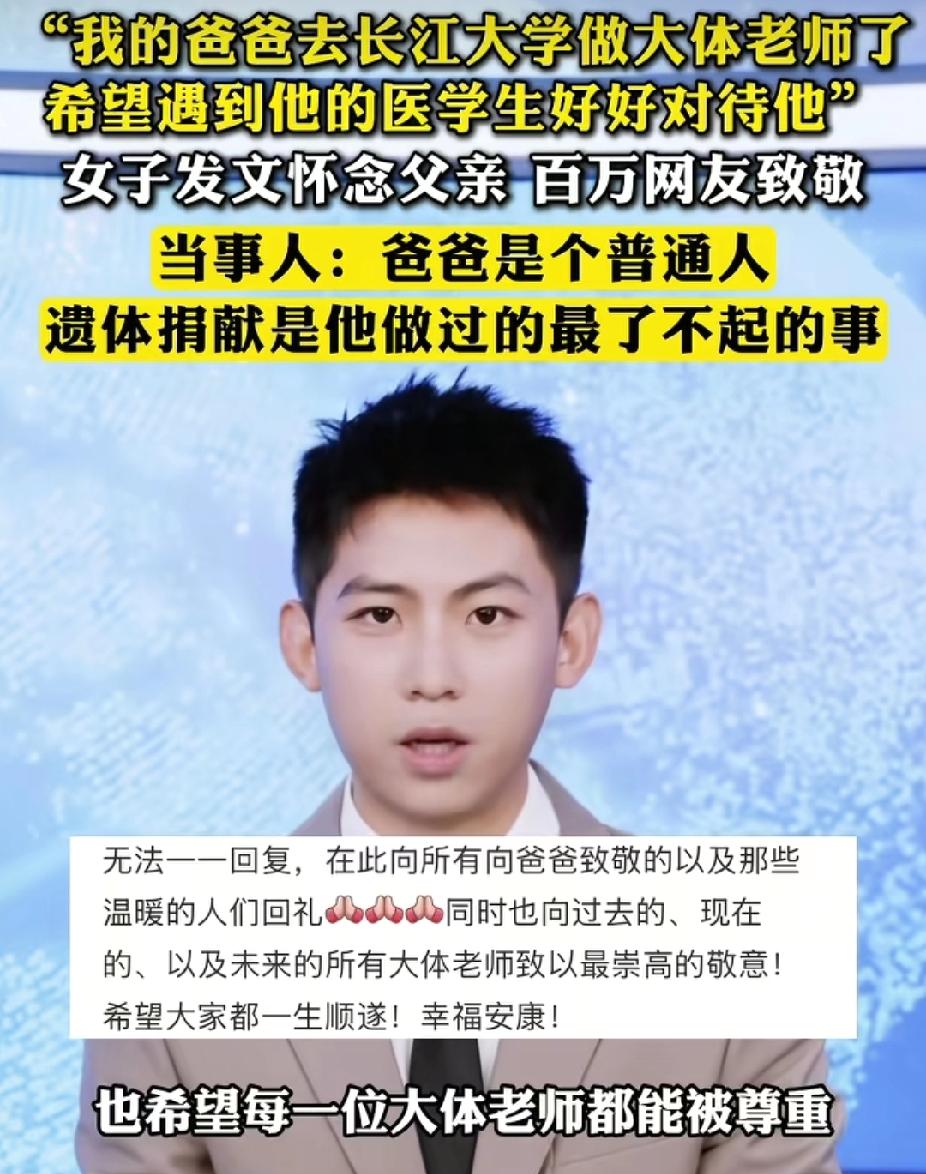 看哭了!女子在网上发帖说: “我的爸爸去长江大学做大体老师了!希望遇到的他医学生好好待他。也祝你们学有所成,成为好医生。”一篇怀念父亲的帖子,引百万网友致敬。女子说: “爸爸已经有两百多万人来看过你啦,有20多万人给你点赞,他们都向你致敬。”网友: 向大体老师致敬,感谢其无私奉献的精神。 原来,毛女士的父亲胡世平是湖北荆州松滋市人,一辈子养鱼卖鱼。而胡世平在十多年前,瞒着家人签下了遗体捐献书。 胡世平去世时73岁,他的家人遵照他的遗愿将遗体送往长江大学,用于医学科研教学。 毛女士因思念父亲,想起父亲,她就止不住地流泪,于是她就在父亲“五七”过后的一天,在网上发了这篇怀念父亲的帖子。 毛女士表示: 爸爸是个普通人,遗体捐献是他做过最了不起的事。她希望每一位大体老师都能被尊重,以生命另一种方式延续。 对此有网友说: 已经签署器官遗体捐献六年了,我女儿又是学医的,以后去女儿的母校。 也有网友说: 我一直很佩服大体老师!目前自己还做不到。 还有网友说: 我经常给我的学生讲认真对待大体老师,当然我们宿舍几个舍友都跟母校签了大体协议。 胡世平老人一生平凡,可他临终前做的这件事,却一点也不普通,他把自己的身体捐给医学院,让学生们去学习、去解剖、去探索人体的奥秘。这需要多大的勇气? 也许很多人连“遗体捐献”这四个字都不敢细想,可是他却在十多年前就瞒着家人默默签了字。 而更让人动容的是,女儿毛女士在父亲“五七”后发了一篇帖子,她不是抱怨父亲做法“太狠心”,而是说:“希望遇到的医学生好好待他。” 一位卖鱼翁,用自己最后的全部,给医学生们上了人生最重要的一课。这不仅仅是对医学事业的奉献,更是对生命最深层的理解——死亡不是终点,被遗忘才是。 女儿毛女士说,这是爸爸做过最了不起的事。 我想说,这也是一个普通人能做的最了不起的事。 “大体老师”这个称呼,其本身就充满了敬意。他们不会说话,不会动,但是却用沉默教会了未来的医生们人体最真实的样子,没有大体老师,就没有优秀的医生。 最后,胡世平老人走了,但他的身体还在“教书”,他的精神还在感染着两百多万看过帖子的人。 而这就是生命的另一种延续方式——不求名垂青史,只愿化作一束微光,照亮后来者的路。 在这里向大体老师致敬,向胡世平老人致敬,也向所有默默做出同样选择的普通人致敬。 (综合来源: 潮新闻、澎湃新闻)