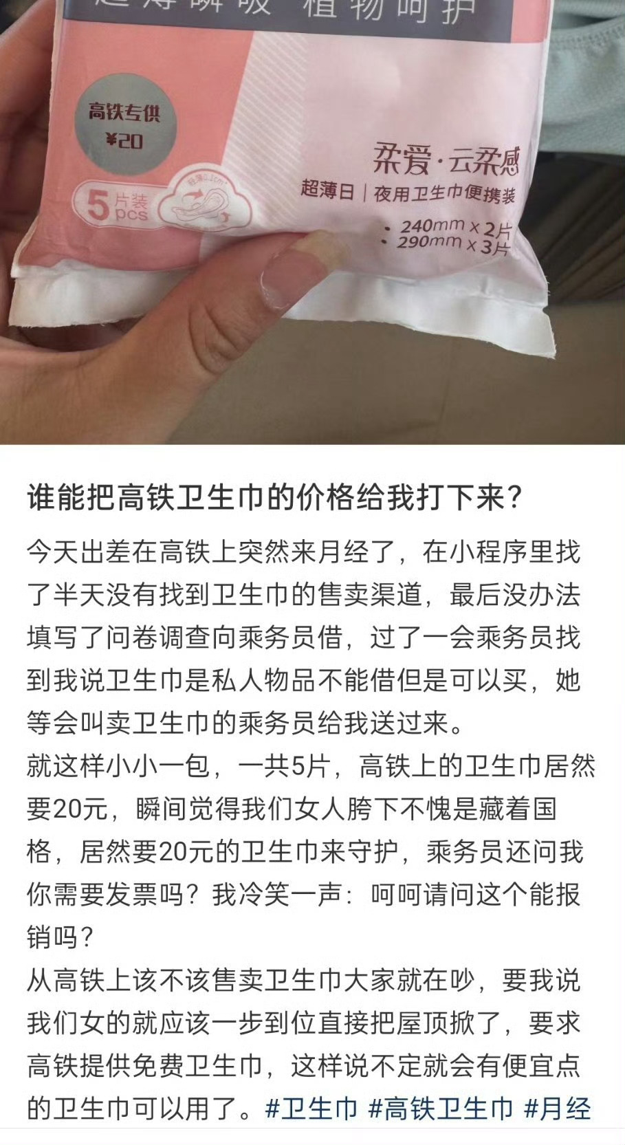 每隔一段时间,网上就有关于高铁卫生巾的争议,在呼吁高铁售卖卫生巾成功落地后,又有声音认为高铁卫生巾贵,甚至有集美呼吁高铁提供免费卫生巾。近日,针对“女子火车上来月经弄脏卧铺,被要求洗床单或赔180元”一事,在 回应后,当事人继续硬刚称,官方通报是不实内容,准备起诉。时事满谈