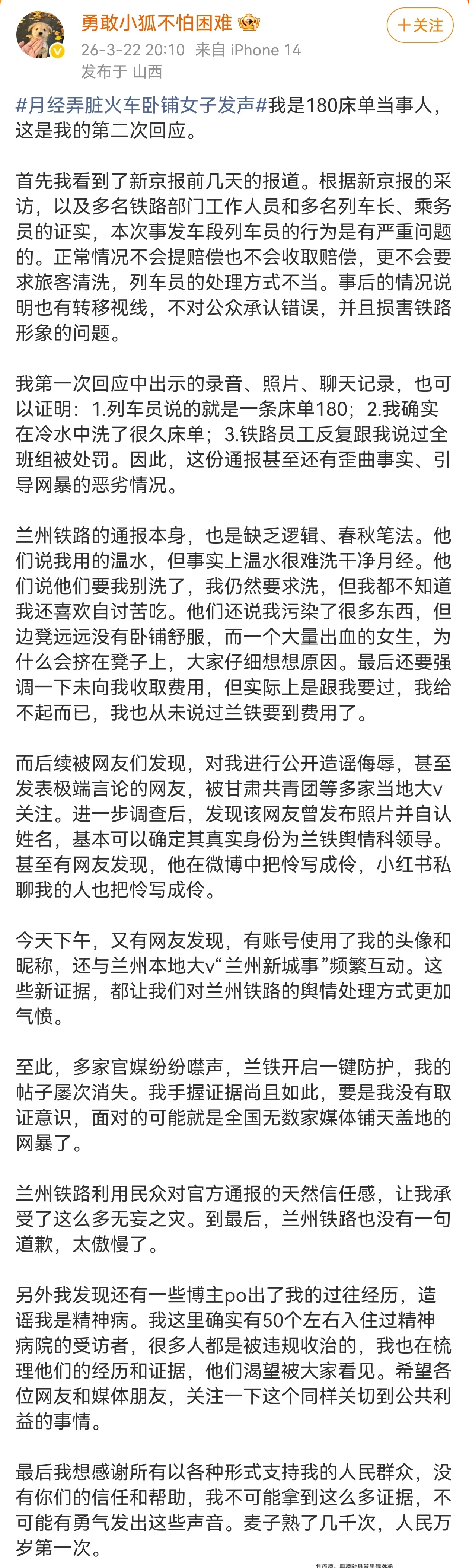 她认为官方通报是歪曲事实,谁质疑谁举证,比起个人的信口开河,我更愿意相信官方,一个人撒谎很容易,兰州客运段的调查想造假,太难了,希望找到当时同车厢的其他乘客,最好有当时的完整监控录像,避免网友因共情生理性女性,而造成认知、判断失误。