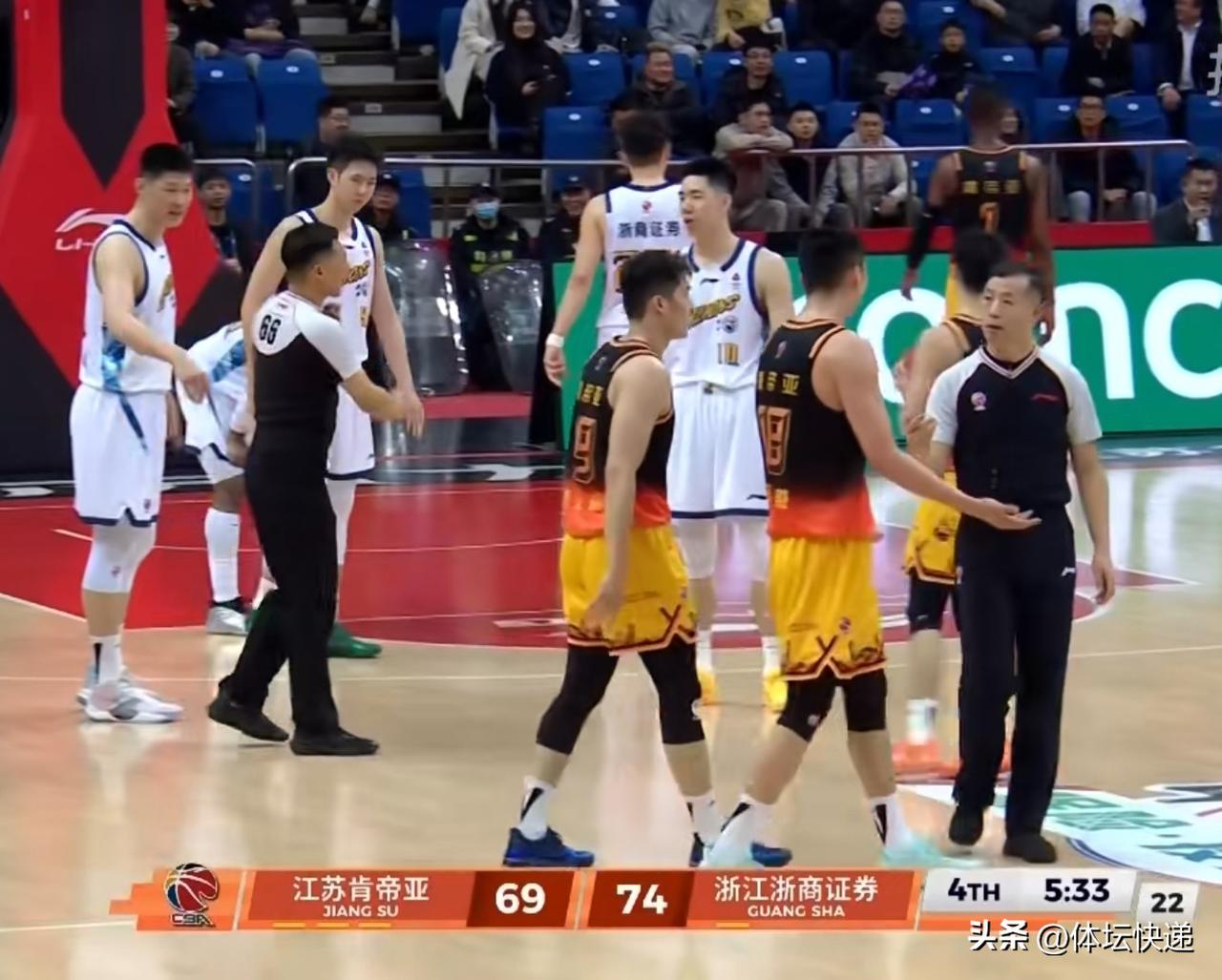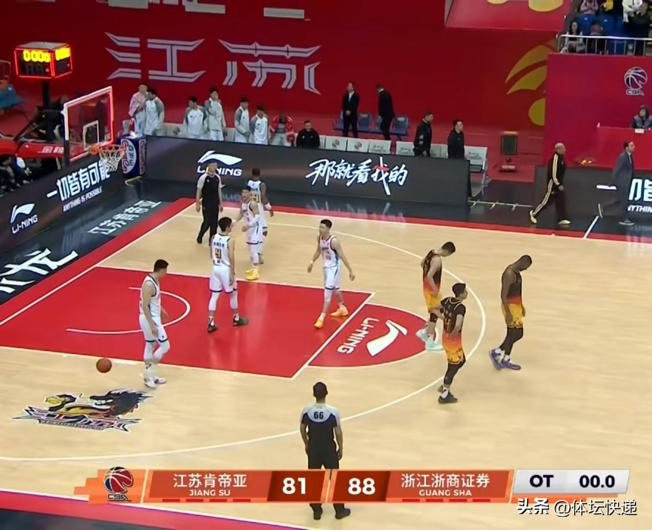 江苏肯帝亚加时惜败浙江浙商证券。CBA常规赛今天晚上继续开打,江苏肯帝亚迎战浙江浙商证券。首节开始,两队进入状态较慢,投篮命中率较低。进入后半段,双方手感回暖,比分一直胶着,浙江浙商证券凭借结束前的高炮台命中,以26:22稍稍占先。次节开局江苏肯帝亚一波攻击流将比分反超,随后双方比分依旧胶着,比赛后段浙江浙商证券再次将比分反超,半场结束,江苏肯帝亚37:43浙江浙商证券。第三节双方依旧难分难解,分差一直不大,浙江浙商证券稍稍占先。三节战罢,浙江浙商证券65:59江苏肯帝亚。第四节开局江苏肯帝亚一波7:3直接打停浙江浙商证券。暂停回来,浙江浙商证券连下4分,江苏肯帝亚叫暂停。暂停回来,塔克与蒋浩然纠缠不清,一记大帽让巴里布朗嘴巴久久难合。比赛还剩3分钟,双方战成74平。比赛结束还剩6秒,双方战成78平。塔克远投不中,双方进入加时赛。加时赛浙江浙商证券一波8:0打停江苏肯帝亚。暂停回来,江苏肯帝亚难挽败局。全场比赛结束,浙江浙商证券88:81江苏肯帝亚,拿到胜利。