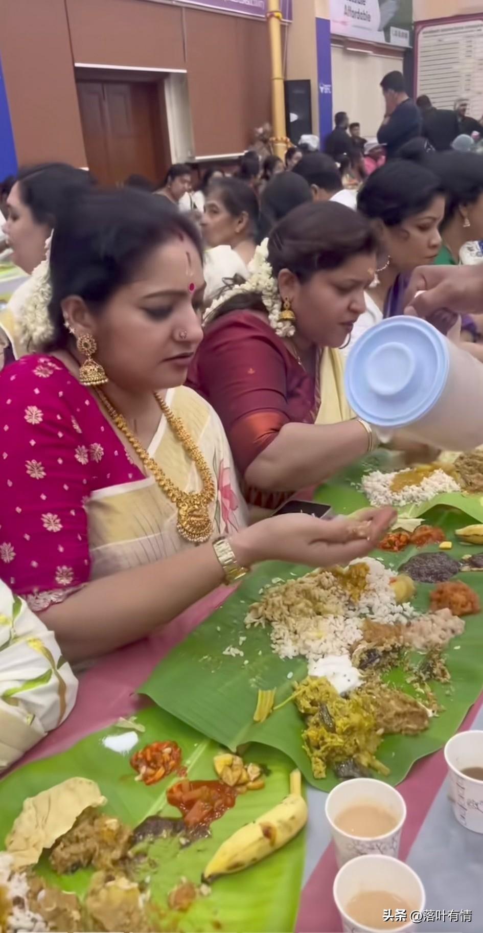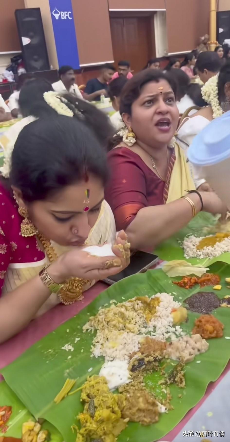 你能想象一群印度人吃席的场面吗? 这就是最真实的印度人吃席名场面, 大家围坐在一张桌子上, 面前是一张超大的芭蕉叶, 然后上面是一些米饭和不同的酱料, 尤其是黄色的咖喱,非常受大家欢迎, 她们都不用餐具, 全部都是用手抓饭吃, 看着身穿华丽服饰的她们, 本来还觉得非常好看, 但是当用手抓饭的那一刻起, 胃里面有些翻涌了, 真不明白她们为什么坚持手抓饭? 明明不卫生,还那么坚持, 还说这是传统, 只有用手抓饭才是最卫生的, 真不知道他们从哪得来的结论, 你能接受印度人用手抓饭吃吗?