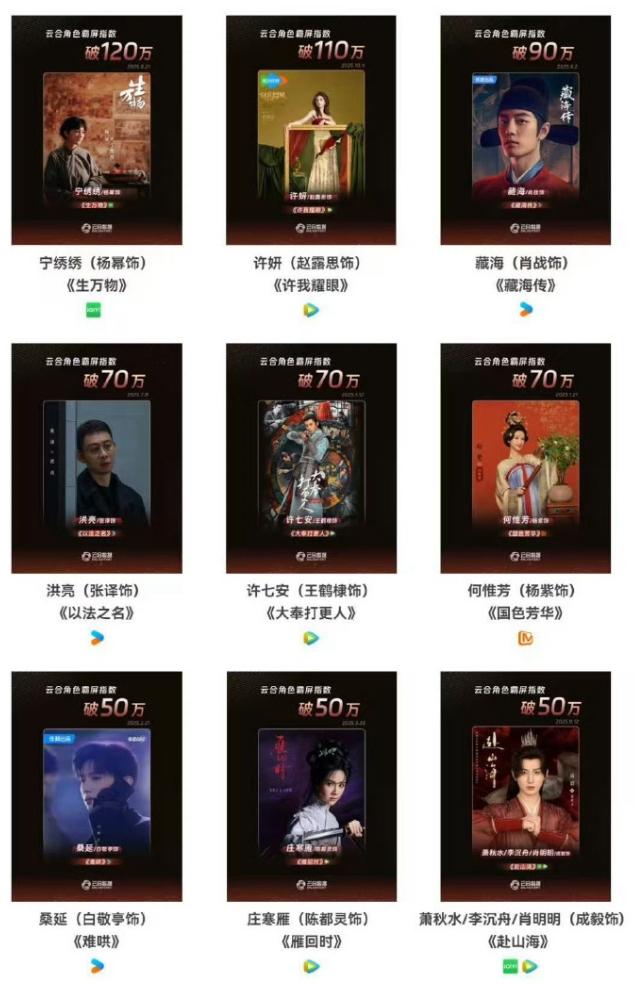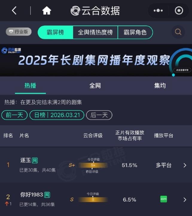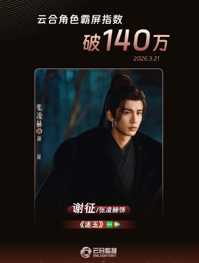 《逐玉》云合集均破5200万! 《逐玉》成为近两年第一部在播期间云合集均破5000万的剧,开播共16天,第14天登榜云合年榜第一,连续8天云合播放量破亿,爱奇艺连续11天热度破万,腾讯累计10天热度破万,恢复双更后,云合占比再次升到50%以上,德V榜连续16天排名第一,德塔文连续15天排名第一,基本已经锁定了26年播放量年冠,张凌赫云合角色霸屏指数破140万,田曦薇60万,啥概念呢?去年全年云合角色霸屏指数第一是《生万物》的杨幂,破120万,第二是《许我耀眼》赵露思110万,第三《藏海传》肖战90万,成毅《赴山海》,白敬亭《难哄》,陈都灵《雁回时》,白鹿《临江仙》,迪丽热巴《利剑玫瑰》都是50万。
