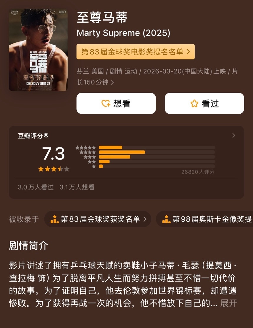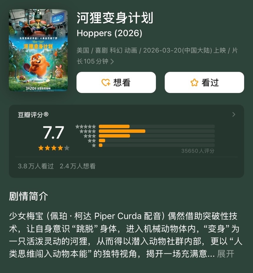 本周上映的好莱坞电影均在豆瓣开出了高分:《挽救计划》8.5《你好,爱美丽》8.0《河狸变身计划》7.7《至尊马蒂》7.3