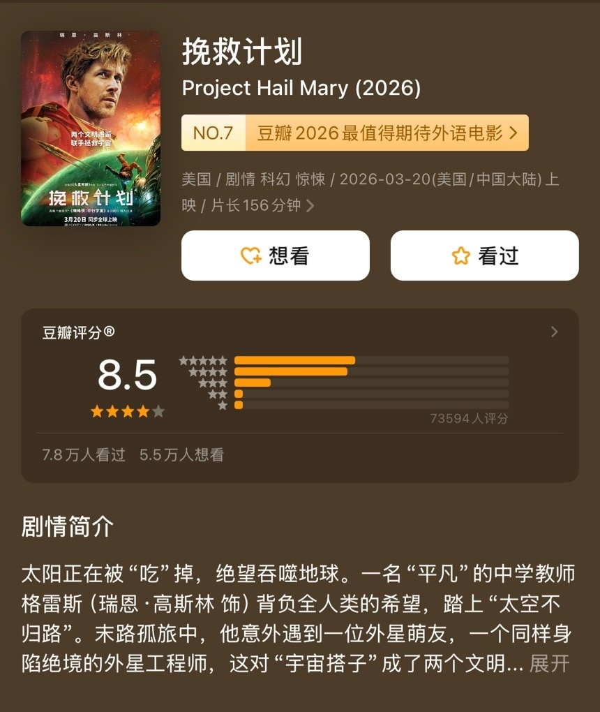 本周上映的好莱坞电影均在豆瓣开出了高分:《挽救计划》8.5《你好,爱美丽》8.0