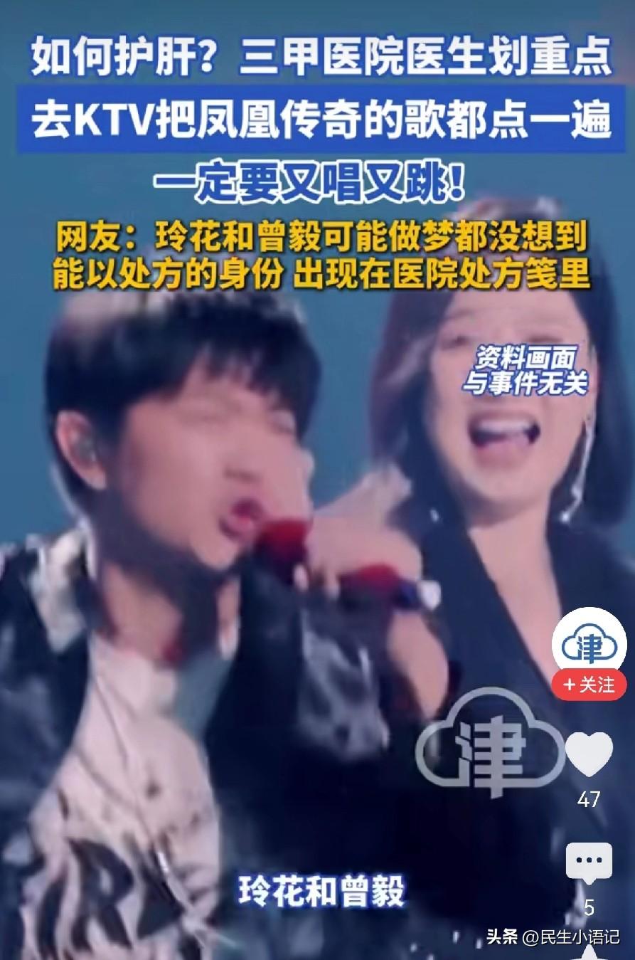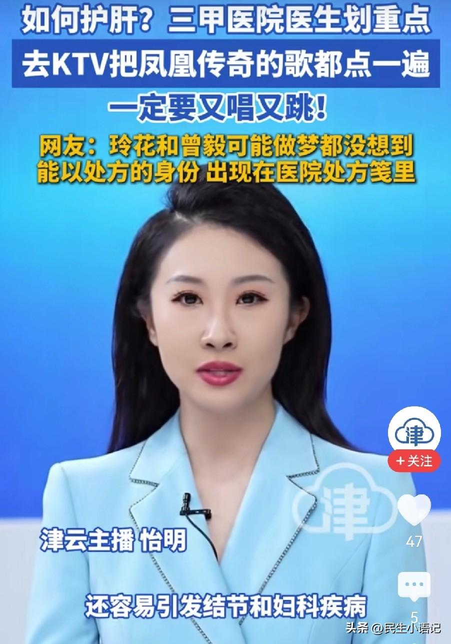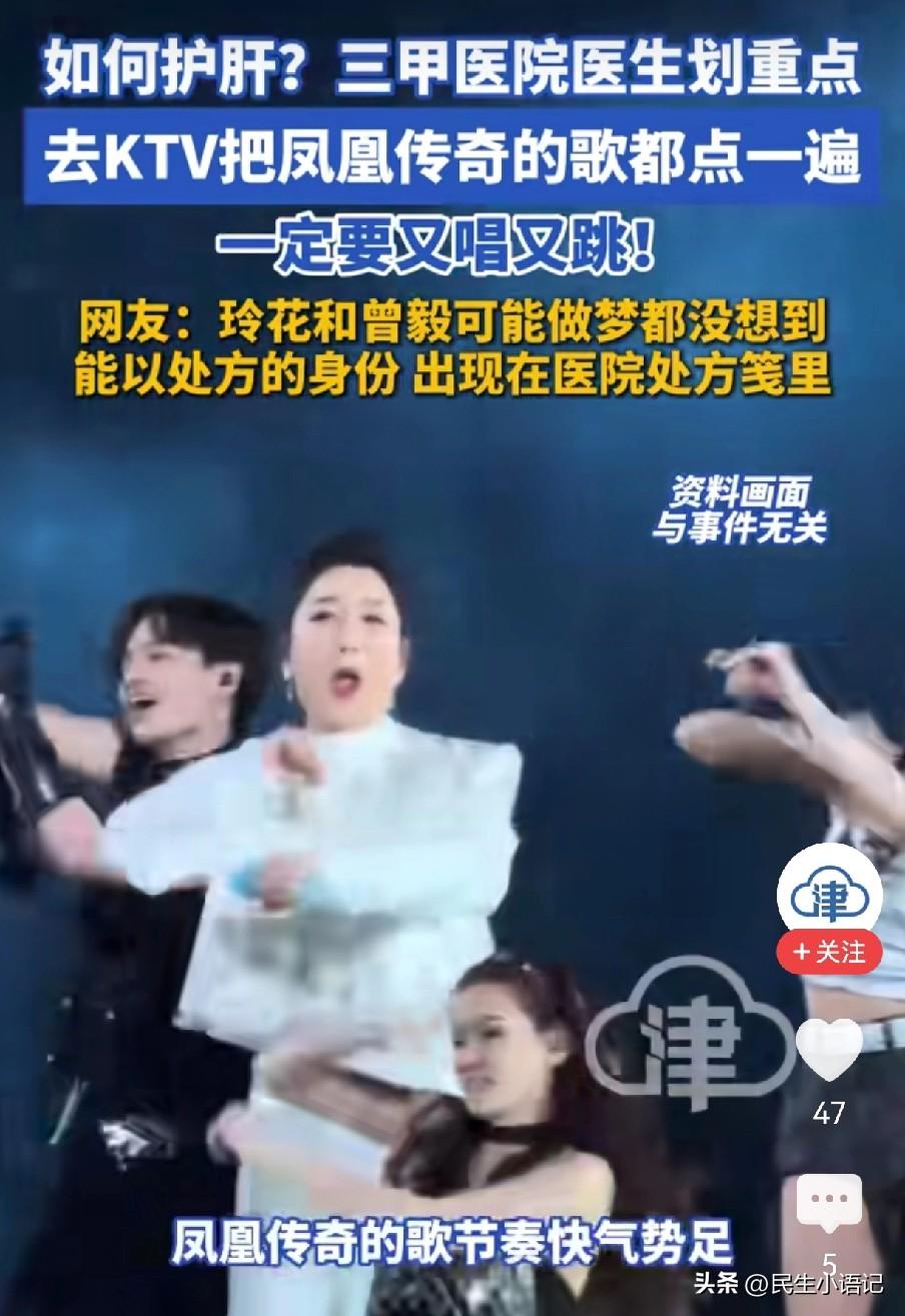“凤凰传奇”的玲花和曾毅,大概做梦也没想到,自己的组合名,竟被三甲医院写进了养生“处方”! 最近,浙江大学医学院附属第二医院中医科主任中医师于慧敏,给大家开出一份超接地气的护肝妙招:想护肝、少生气、不郁结,别硬憋着,去KTV把凤凰传奇的歌全点一遍,一定要又唱又跳! 他们的歌节奏明快、气势拉满,旋律敞亮又解压。放开嗓子吼、跟着节奏动,把委屈、压力、闷气一股脑喊出来,刚好疏肝理气、疏通气血,比闷在心里伤身强太多。 火了二十多年的国民组合,从广场舞顶流,意外变身全民“护肝搭子”。玲花和曾毅大概也没想到,陪伴几代人的歌声,最后还成了中医认证的情绪解压神器。 这波跨界也太可爱了,下次心情不好,直接赴一场凤凰传奇的KTV之约,边唱边跳,把肝气唱顺、把心情唱亮!有没有要试一试的朋友啊,欢迎评论区留下您的宝贵意见。 (图片来自网络视频)
