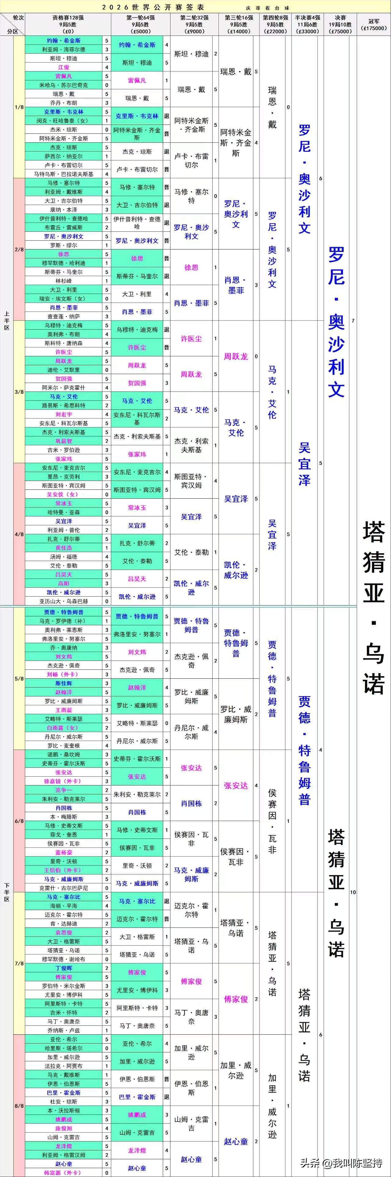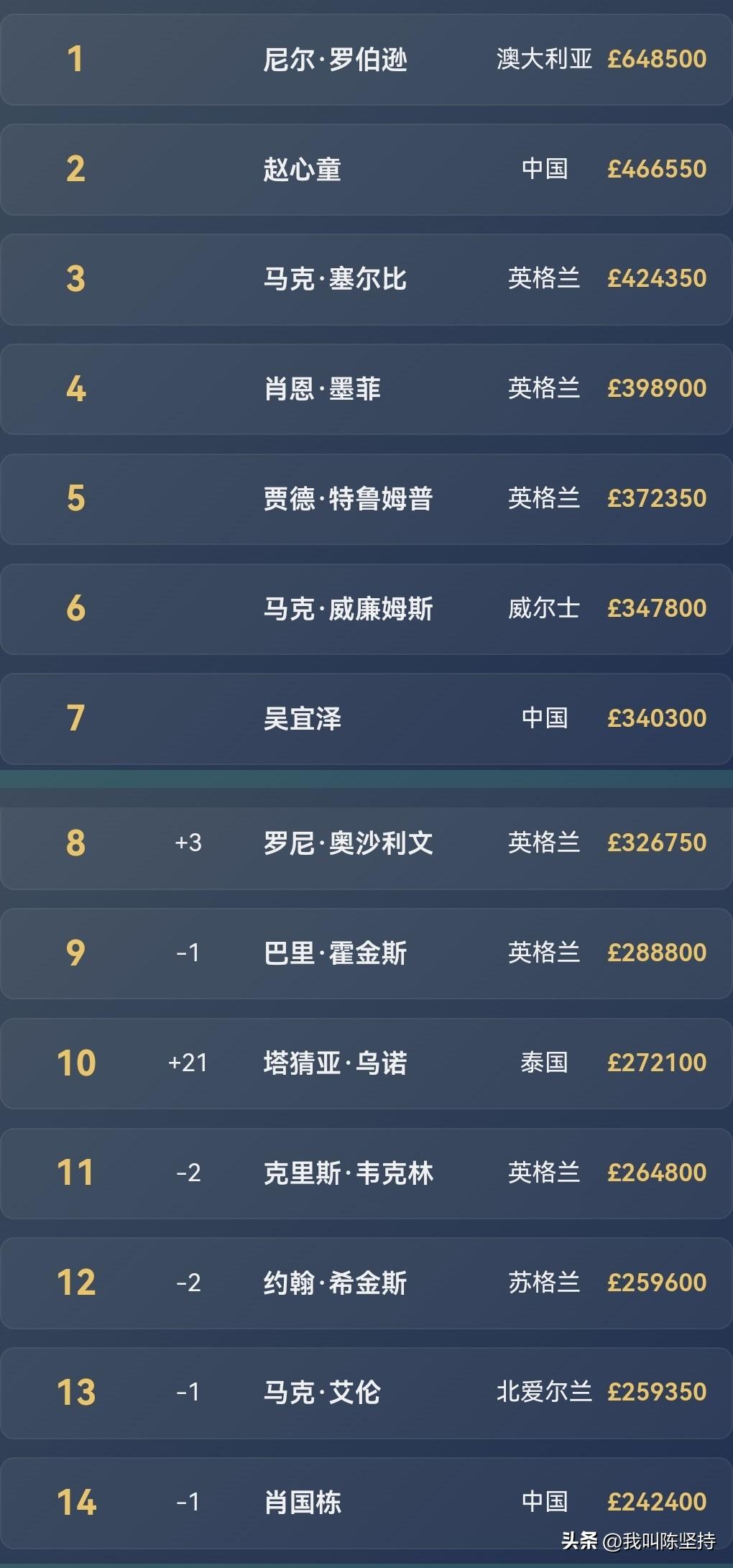 真正的黑马,塔猜亚在比赛最后时刻打出4连鞭,包括三杆过百,一杆147,10-7击败奥沙利文夺得玉山公开赛冠军。 比赛一波三折,最开始奥沙利文打出4-0的比分,塔猜亚回敬一波6连鞭,6-4领先,奥沙利文打出3连,7-6反超比分。最后时刻,塔猜亚再度超车,10-7收获胜利。 此次胜利意义重大,塔猜亚收获第一个大型排名赛冠军,获得冠中冠资格。 单赛季排名塔猜亚到达第10,获得巡回锦标赛资格。肖国栋被挤到第14,失去资格。赵心童和吴宜泽两名中国球员参加巡回锦标赛。 塔猜亚的世界排名到达22位,如果在之后的巡回锦标赛夺冠,将把丁俊晖挤出前16,那么丁俊晖将参加世锦赛的资格赛。 塔猜亚也成为首个拿下147,却无法获得单杆最高奖的球员,5000英镑奖金被打出单杆153分的奥沙利文获得。 火箭其实也没什么太大的遗憾,毕竟能闯进决赛还创纪录的打出153,已经依稀找回巅峰期的手感,只是这次遇到了开挂的塔猜亚,而且不再是以前的玻璃心,最后三连破百的完美发挥让火箭输的心服口服,还是不得不感叹岁月无情,以前上演这样惊艳一幕的往往是自己,而现在自己却成了成就对方的背景板。