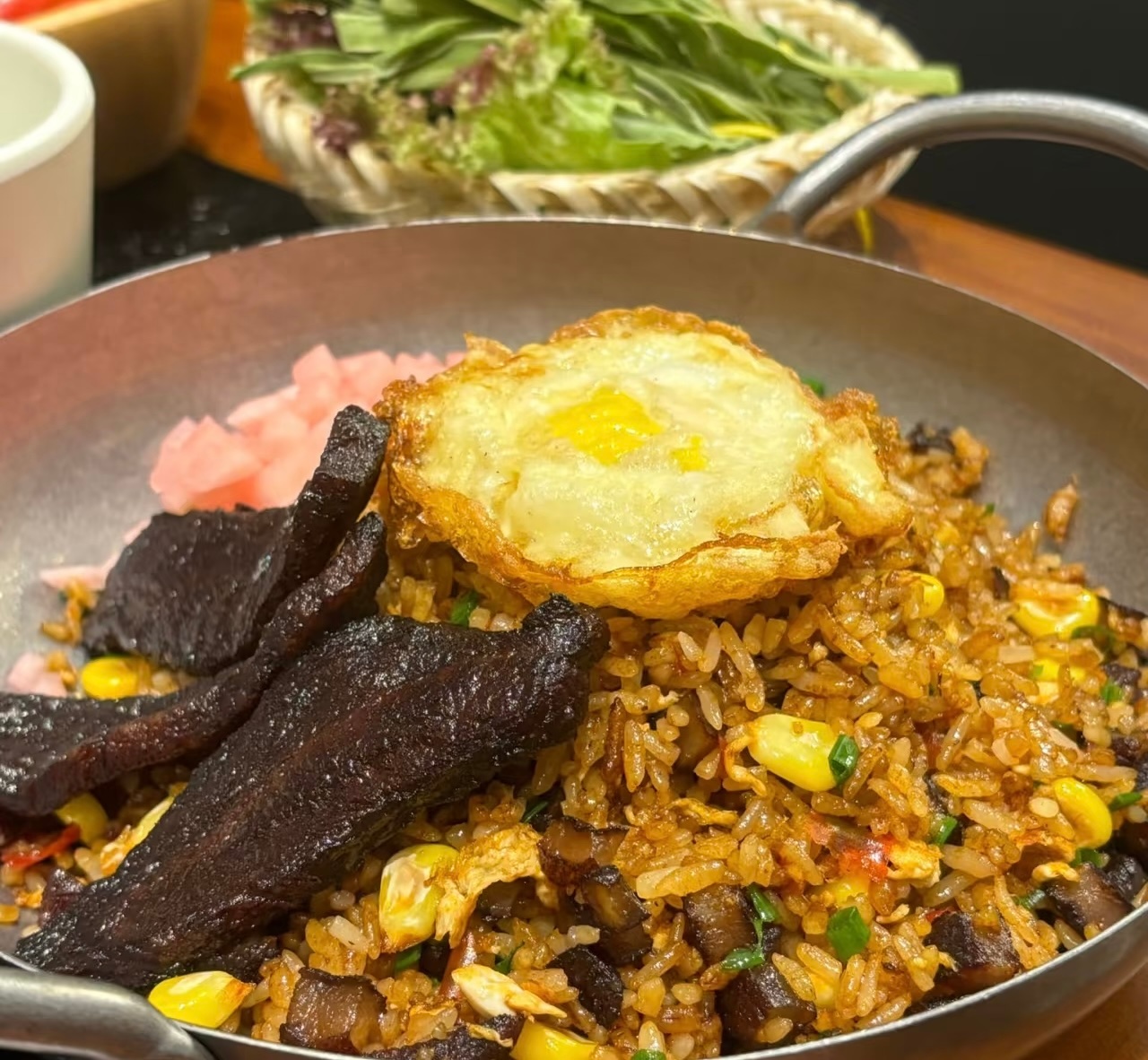 减肥的两个人按着炒饭就吃,腊肉饭配酸萝卜香个跟头。这个形态的荷包蛋我不爱吃,但是