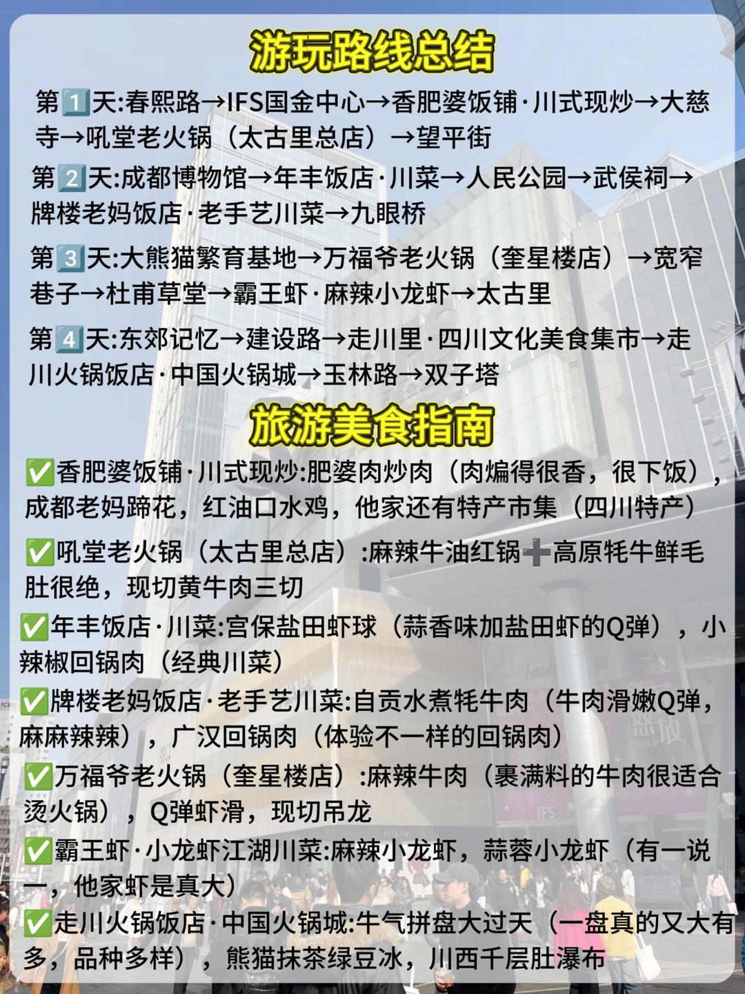 1⃣️:春熙路→IFS国金中心→香肥婆饭铺→大慈 寺→吼堂老火锅→望平街