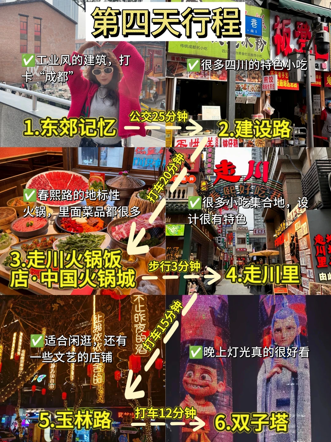 4⃣️:东郊记忆→建设路→走川里·四川文化美食集市→走川火锅饭店→玉林路→双子塔