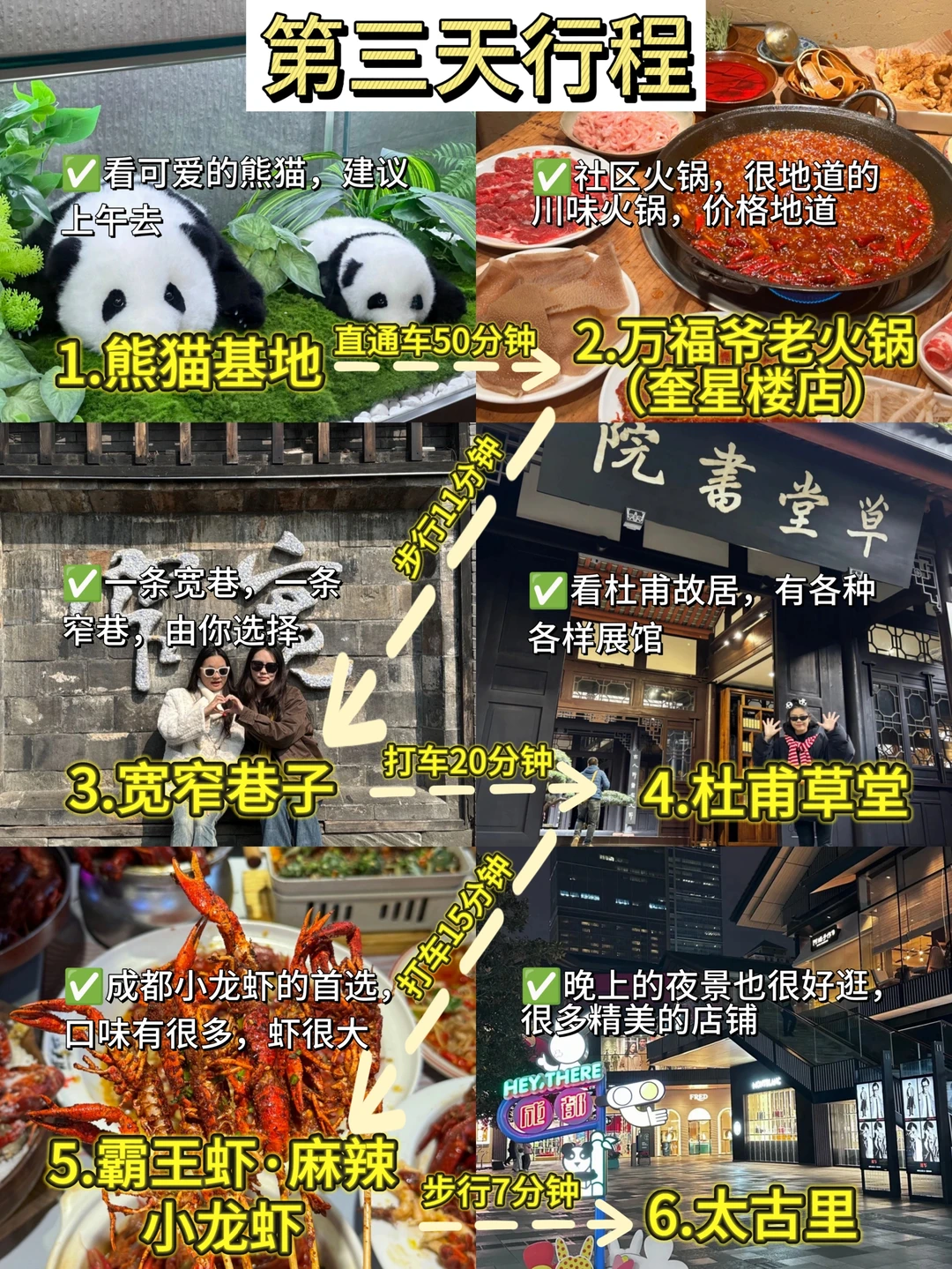 3⃣️:大熊猫繁育基地→万福爷老火锅→宽窄巷子→杜甫草堂→霸王虾→太古里
