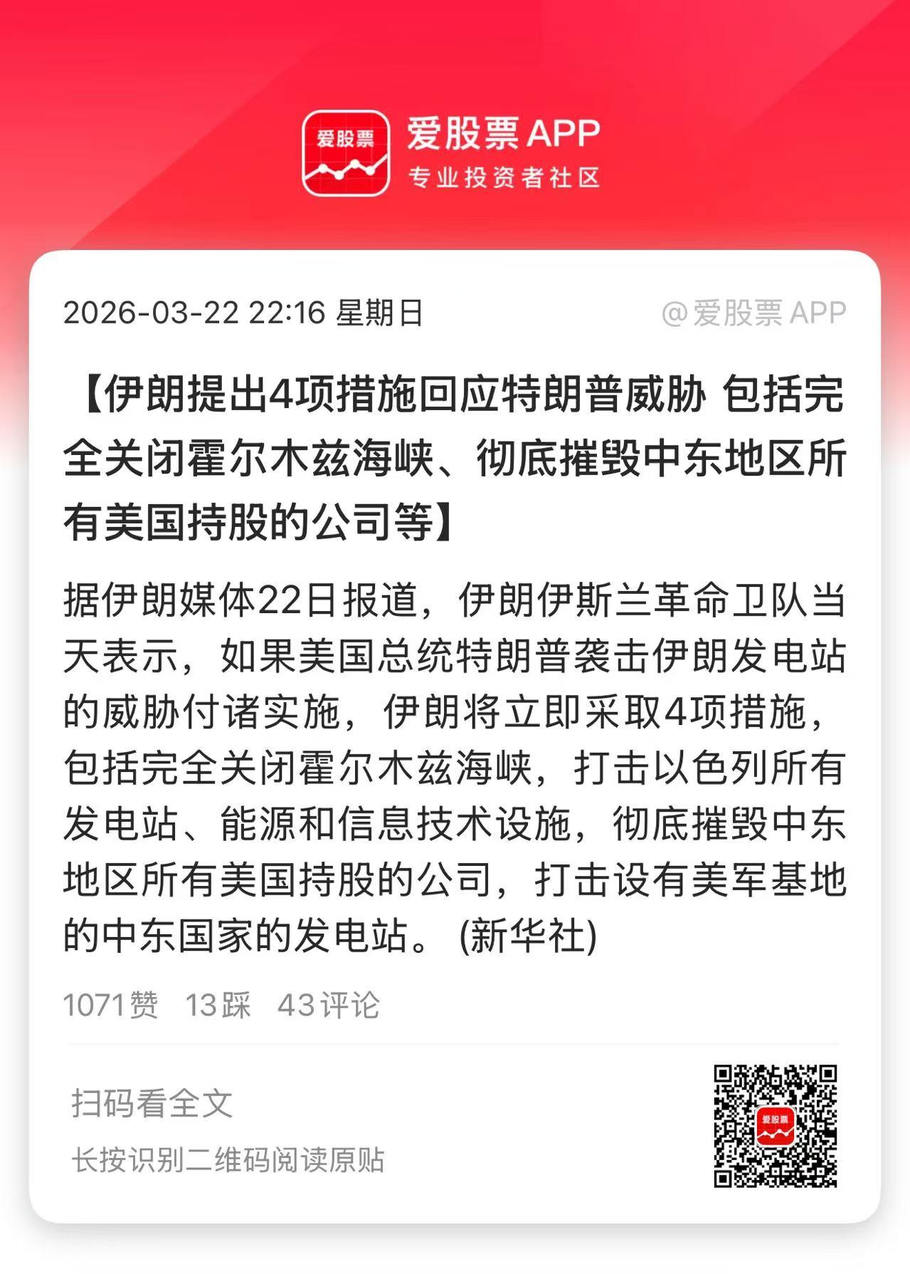 周末中东局势扑朔迷离,昨天本以为降温了,今天又开始升温了。川普向伊朗发出48小时最后通牒,伊朗自然也不服软,发出强硬警告! 不过,晚上最新消息,美国、伊朗都给出了停战条件。美国给出了6项,伊朗也是6项。刀锋看了下,对伊朗来说,关于弹道导弹的条款,可能是最难接受的,这是伊朗安身立命的杀手锏;对美国来说,解除制裁很有可能,给安全承诺应该可以,但赔偿可能性不大。 双方肯定还有分歧的,但双方现在都耗不起了,估计阶段性的和谈时间也不远了!今天还有一个消息,特朗普团队已密谋“和谈”,这也算释放了缓和信号。 总之,美伊最大的可能性还是边打边谈,接下来1~2周,可能是最后掀底牌的阶段。我觉得大概率在3月底,中东乱局对全球影响会迎来最高潮!大家还需要继续熬一熬。 周五美股、黄金暴跌,而油价继续大涨,这显然是坏消息。虽然周末央妈等释放了一些利好,但明天低开很难跳掉的,就开低开后有多少资金抄底了!最近几周,A股股民这军费都掏麻了!真的太难了。