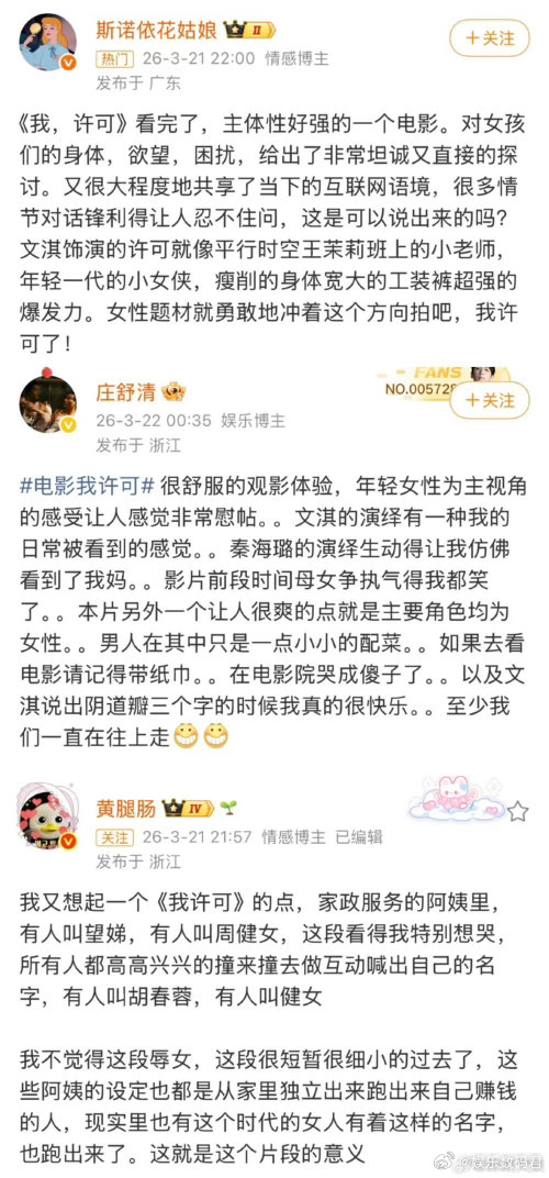 电影我许可首波观众反馈文淇新片我许可点映口碑 点映口碑确实可以。有观众说边笑边哭,母女线很戳人。那些平时不太提的话题,电影里都直接说了。这种敢拍的电影确实值得看。