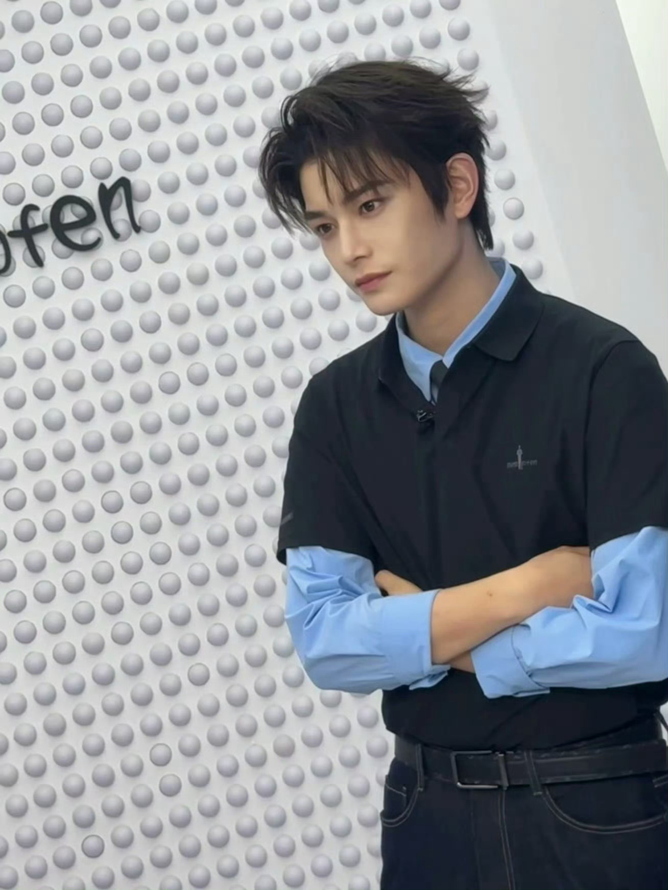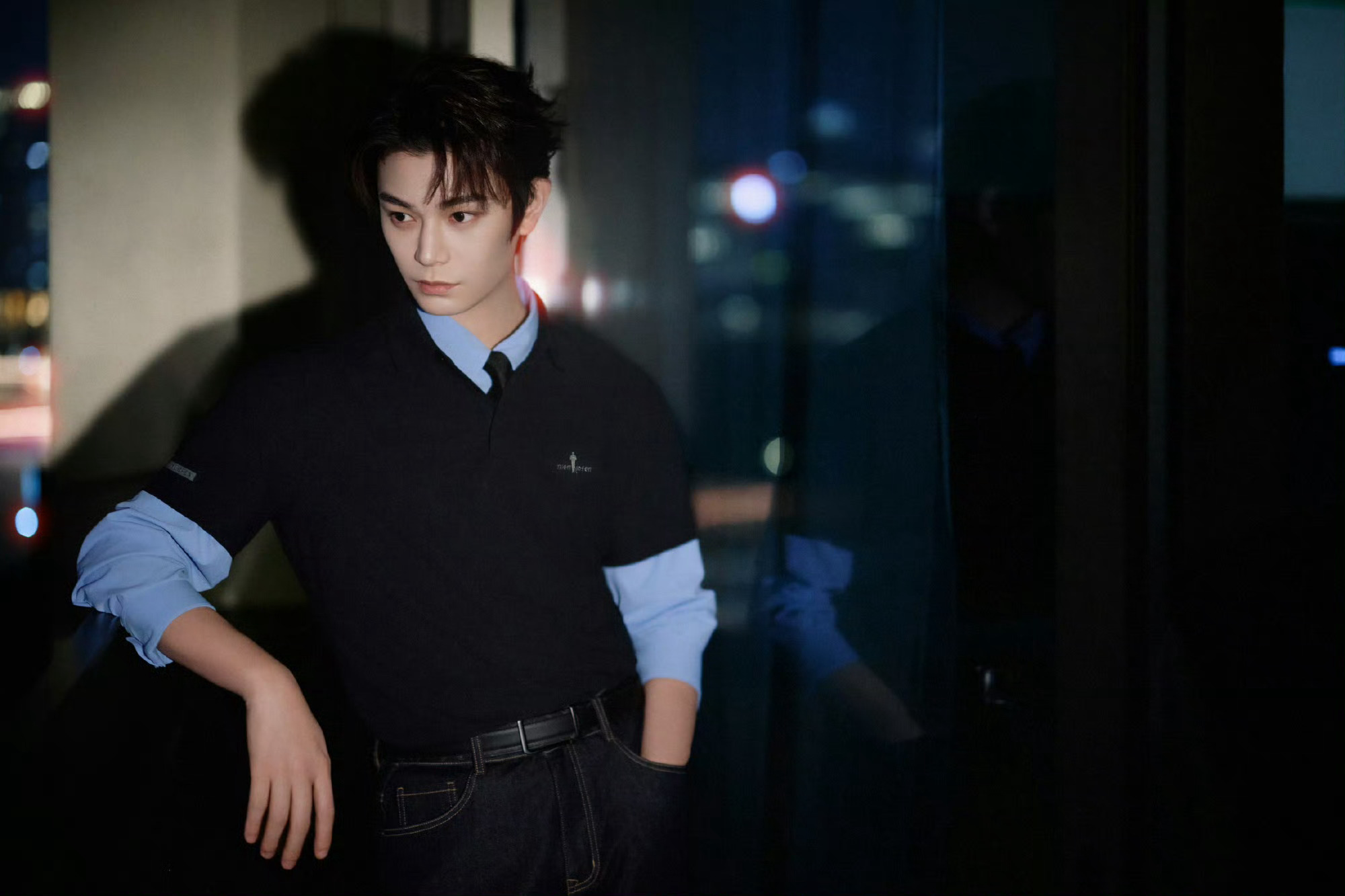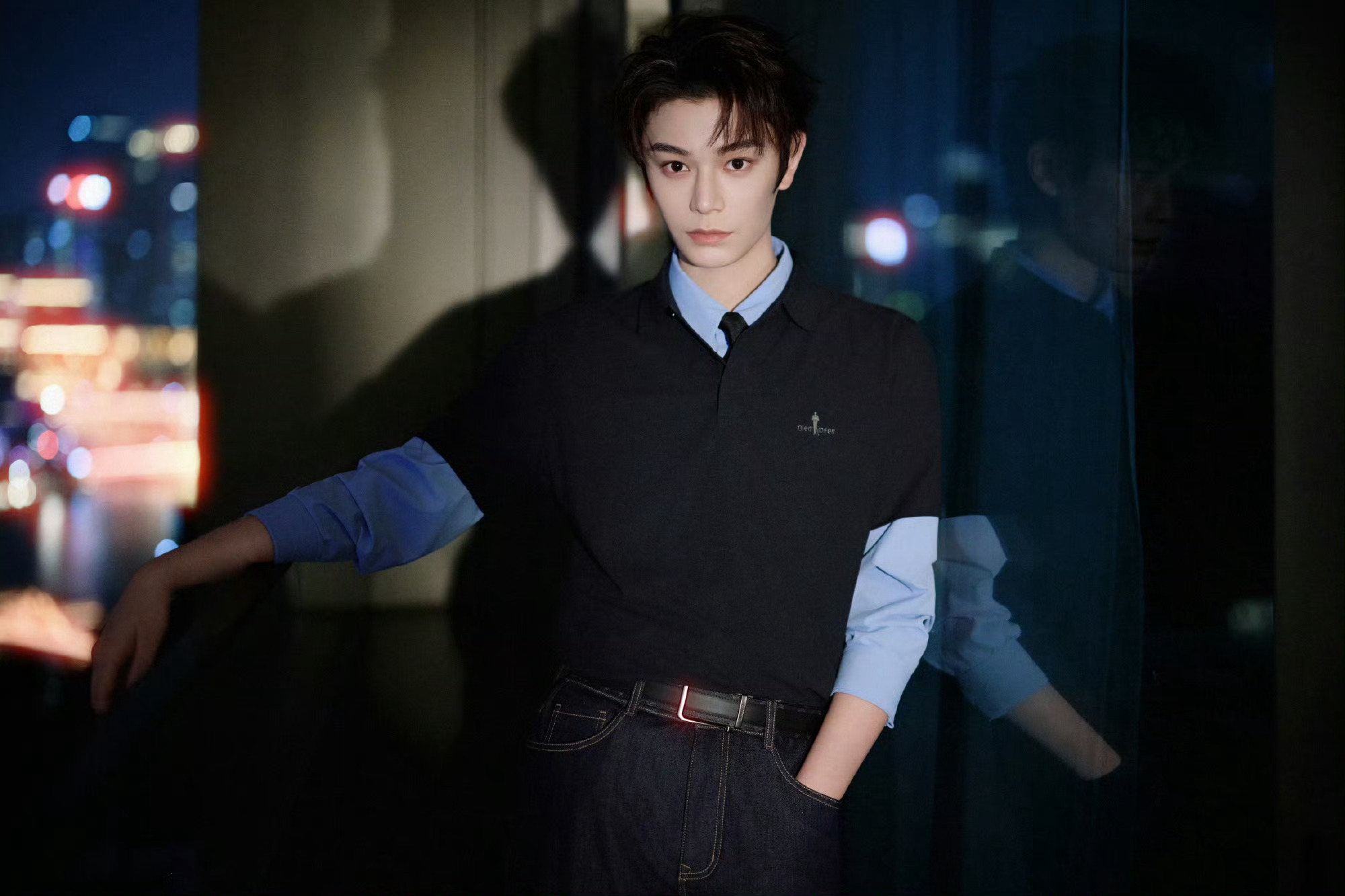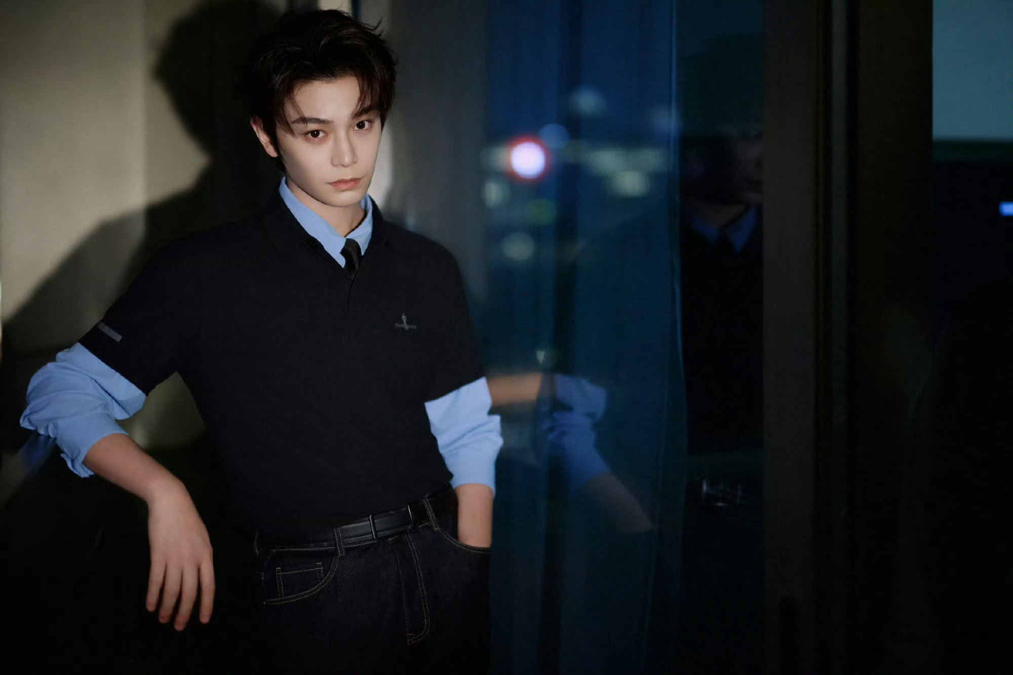 丁禹兮 今日品牌活动造型图集,蓝色衬衫叠穿Polo衫,再搭配牛仔裤,简约的蓝色系