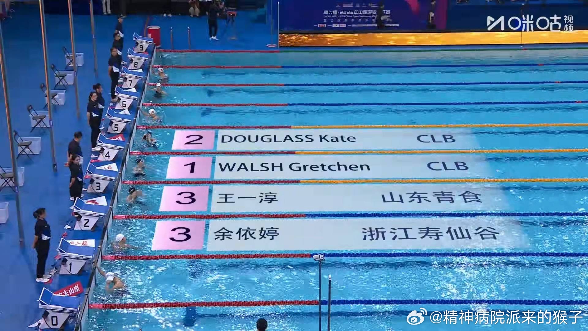 2026年中国游泳公开赛 女子50米蝶泳决赛:G沃尔什25.12获得冠军🥇道格拉斯25.34获得亚军🥈余依婷与王一淳25.94并列获得季军🥉张雨霏25.95获得第四名
