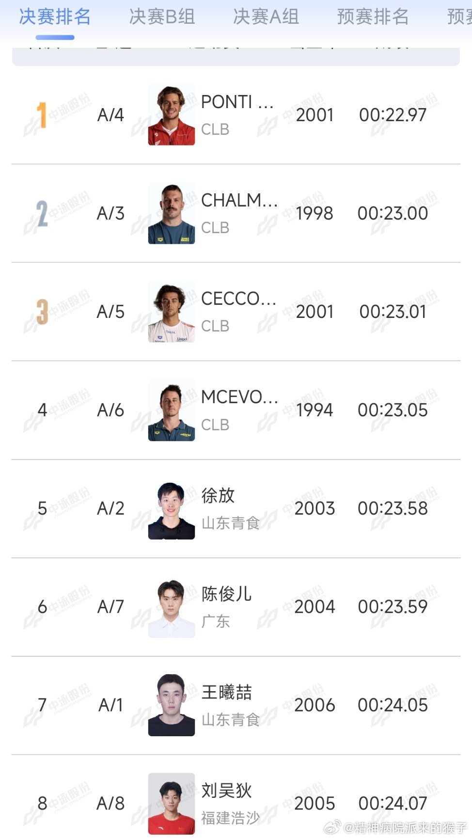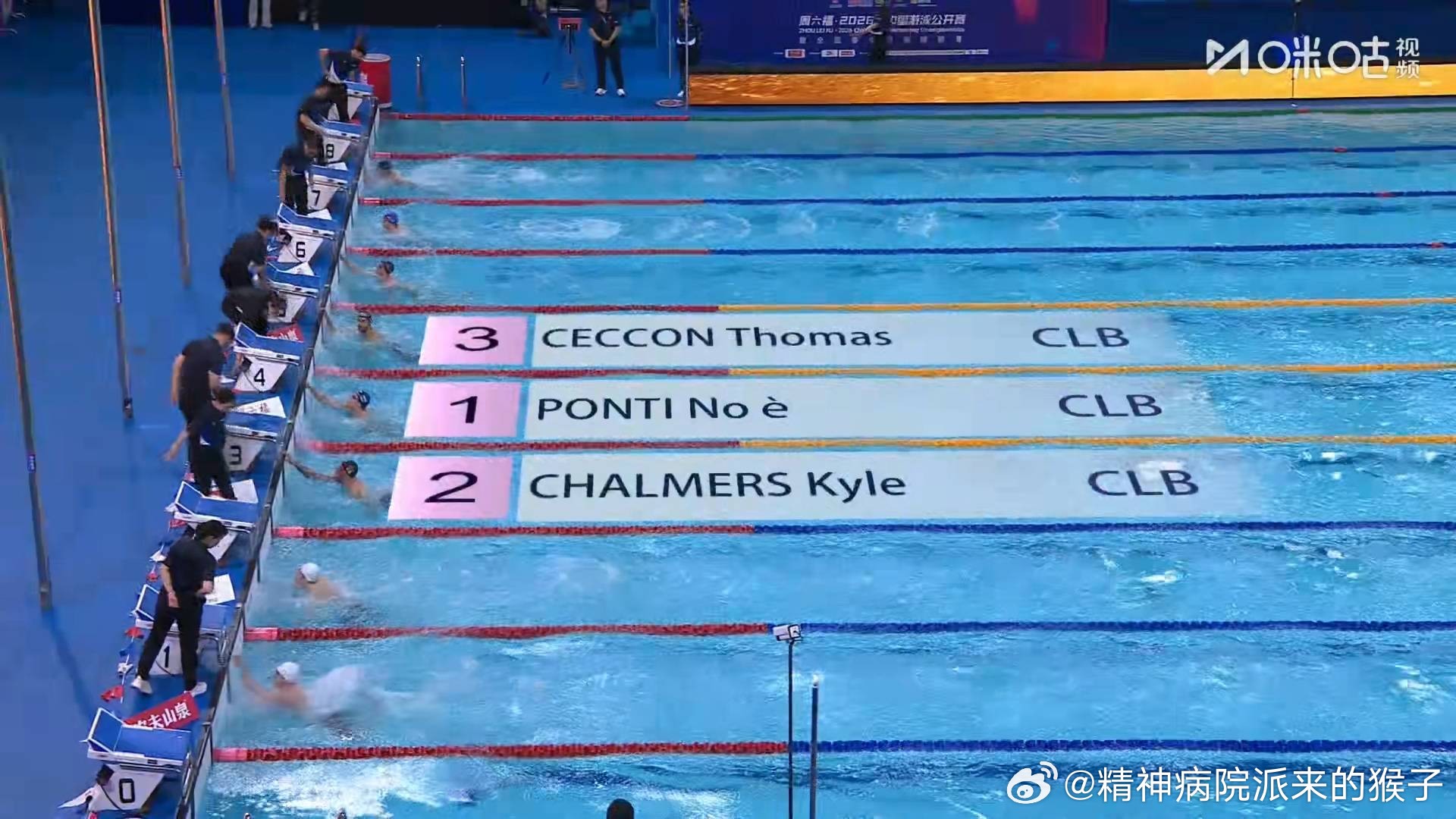 2026年中国游泳公开赛 男子50米蝶泳决赛:庞蒂22.97获得冠军🥇查尔莫斯23.00获得亚军🥈切孔23.01获得季军🥉徐放23.58获得第五名