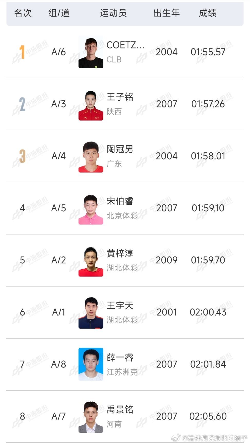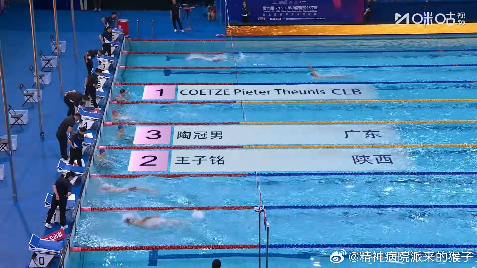 2026年中国游泳公开赛 男子200米仰泳决赛:科策1:55.57获得冠军🥇王子铭1:57.26获得亚军🥈陶冠男1:58.01获得季军🥉