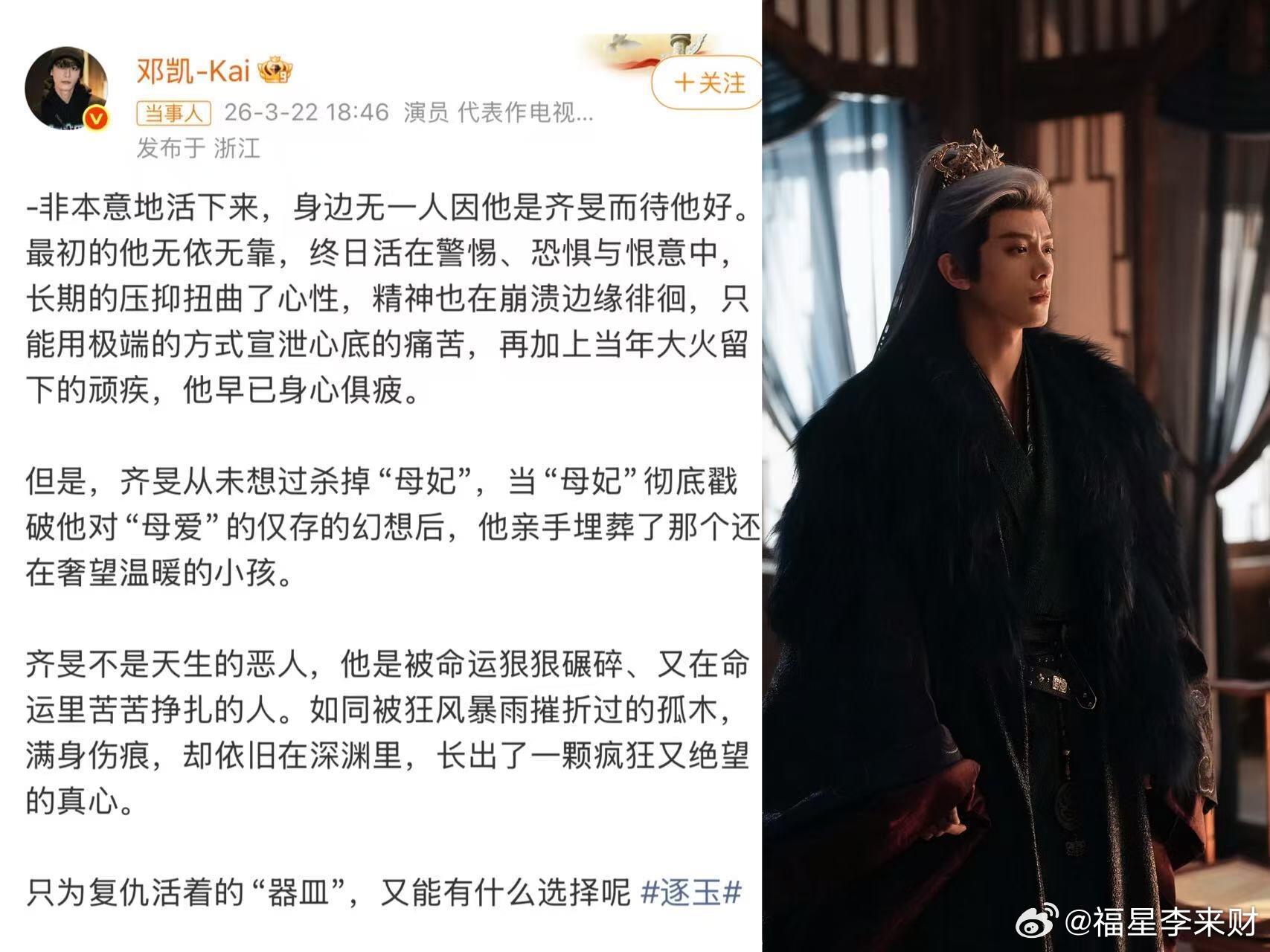 邓凯发长文解读齐旻杀母妃 不愧能上桌字里行间全是对这个角色的深层次理解齐旻从不是天生暴戾,只是命运从未给过他半分温柔。非本意地活下来,身边无人真心待他,终日在警惕、恐惧与恨意中挣扎,大火留下的顽疾与长期压抑,早已让他身心俱疲、心性扭曲。“齐旻从未想过杀掉“母妃”,当“母妃”彻底戳破他对“母爱”的仅存的幻想后,他亲手埋葬了那个还在奢望温暖的小孩。”“齐旻不是天生的恶人,他是被命运狠狠碾碎、又在命运里苦苦挣扎的人。如同被狂风暴雨摧折过的孤木,满身伤痕,却依旧在深渊里,长出了一颗疯狂又绝望的真心。”真的作为观众很心疼这个角色