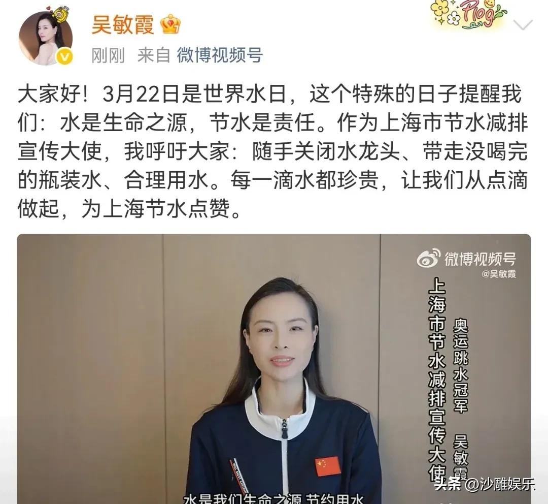 吴敏霞,高调发文! 3月22日,一个本该平静的日子,奥运跳水冠军吴敏霞却突然在社交平台高调发声,字里行间透着严肃劲儿,甚至还直接向网友发出了呼吁——这到底唱的是哪出? 原来,这一天是世界水日。吴敏霞以“上海市节水减排宣传大使”的身份,在微博发布了一则节水宣传视频。视频里,她身穿带有中国国旗的运动外套,整个人透着运动员特有的精气神,语气亲切却掷地有声:“水是生命之源,节水是责任。” 她没有讲大道理,而是从日常场景切入,给出了三件人人都能做到的小事:随手关紧没拧好的水龙头、带走没喝完的瓶装水、养成合理用水的习惯。最后还不忘补一句——“每一滴水都珍贵,一起为上海节水点赞。” 说实话,这种公益宣传平时见得不少,但吴敏霞这条,评论区直接炸了。 为什么是她?因为没人比她更懂“水”的重量。作为曾经在跳水池里为国家争得无数荣誉的奥运冠军,吴敏霞与水相伴二十多年,从赛场上的极限挑战到如今的生活守护,她把对水的敬畏从竞技场延续到了日常。这种身份的反差与延续,让一句“节水是责任”听起来格外有分量——她不是随便说说的局外人,而是真正与水深度绑定的人。 不少网友直言:“看了那么多公益宣传,吴敏霞这个是真的能记住。”为什么?因为她没有摆架子,没有用那种高高在上的说教口吻,而是直接把节水细化成了三个动作。这种“可执行性”恰恰是很多公益宣传缺失的。网友调侃:“奥运冠军教我省水,这面子我给了!” 有网友笑称:“吴敏霞:我当年在水里翻腾那么多圈,每一滴水都见证过我的努力,你们可别浪费了!” 还有人说:“从跳水台到水龙头,吴敏霞这是把职业生涯贯彻到底了。 说实话,现在的热搜动不动就是明星翻车、八卦撕扯,像吴敏霞这样安静做公益、认真履行大使职责的,反而成了一股清流。她没有借机营销,没有蹭热度,选在世界水日这一天,用自己最熟悉的“水”作为切入点,朴素、真诚、有力量。 公众人物的影响力,说白了就是用在哪里、怎么用的问题。吴敏霞这波操作,既没有用力过猛,也没有敷衍了事,而是把自己最擅长的东西和最需要被关注的社会议题结合在一起——这种自然流露的责任感,比任何精心策划的营销都打动人。 有网友总结得很到位:“她不是在水里拿冠军才了不起,是离开了泳池,依然记得自己为什么被看见,这才了不起。” 水是生命之源,这句话谁都会说。但当这句话从一位把青春都交付给水的奥运冠军口中说出来时,它就不再是空洞的口号,而是一种带着温度的回响。 吴敏霞用三件小事告诉我们:伟大不是只存在于赛场上的那一跃,也藏在日常里每一次拧紧水龙头的动作中。