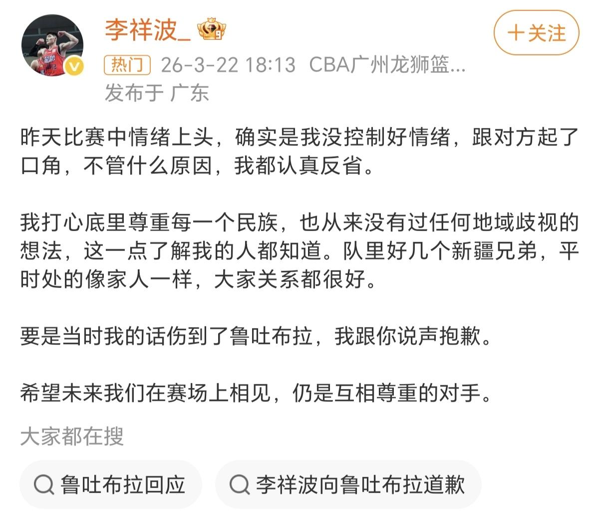 CBA官方转发李祥波鲁吐布拉社媒,不当言论这事可能不了了之!