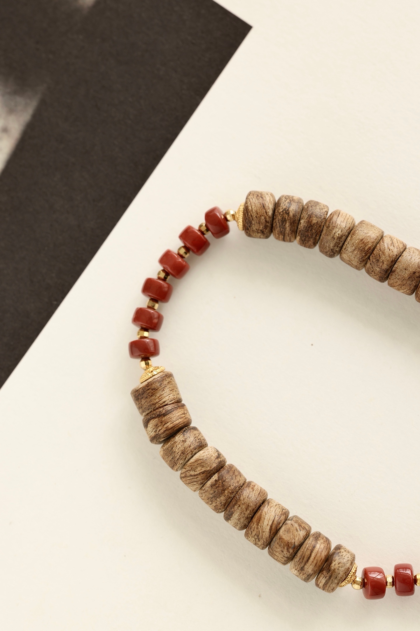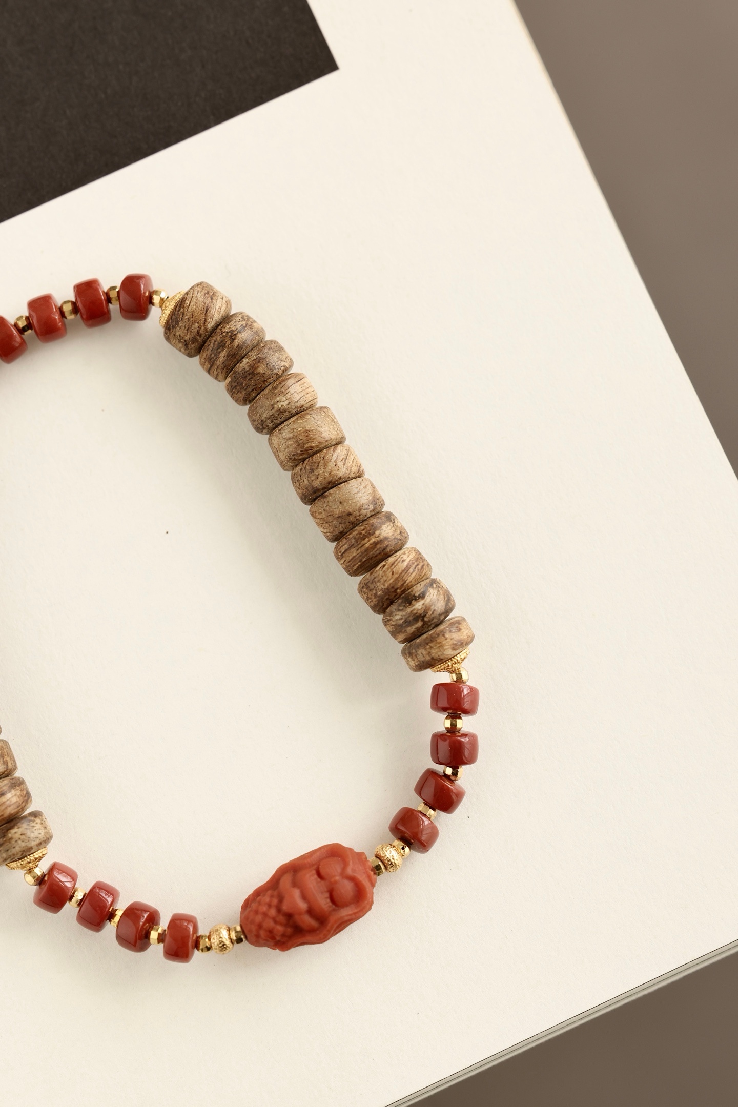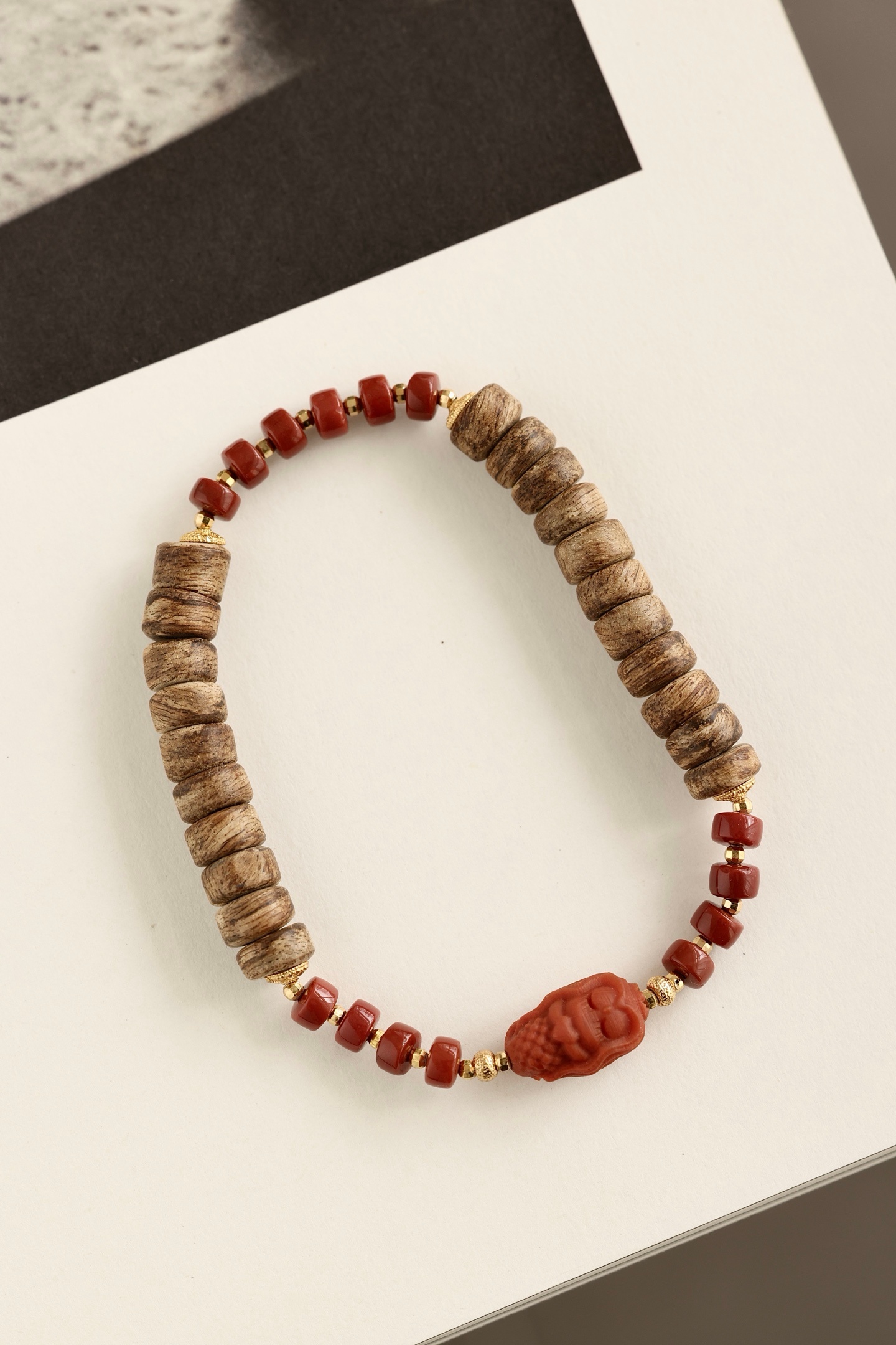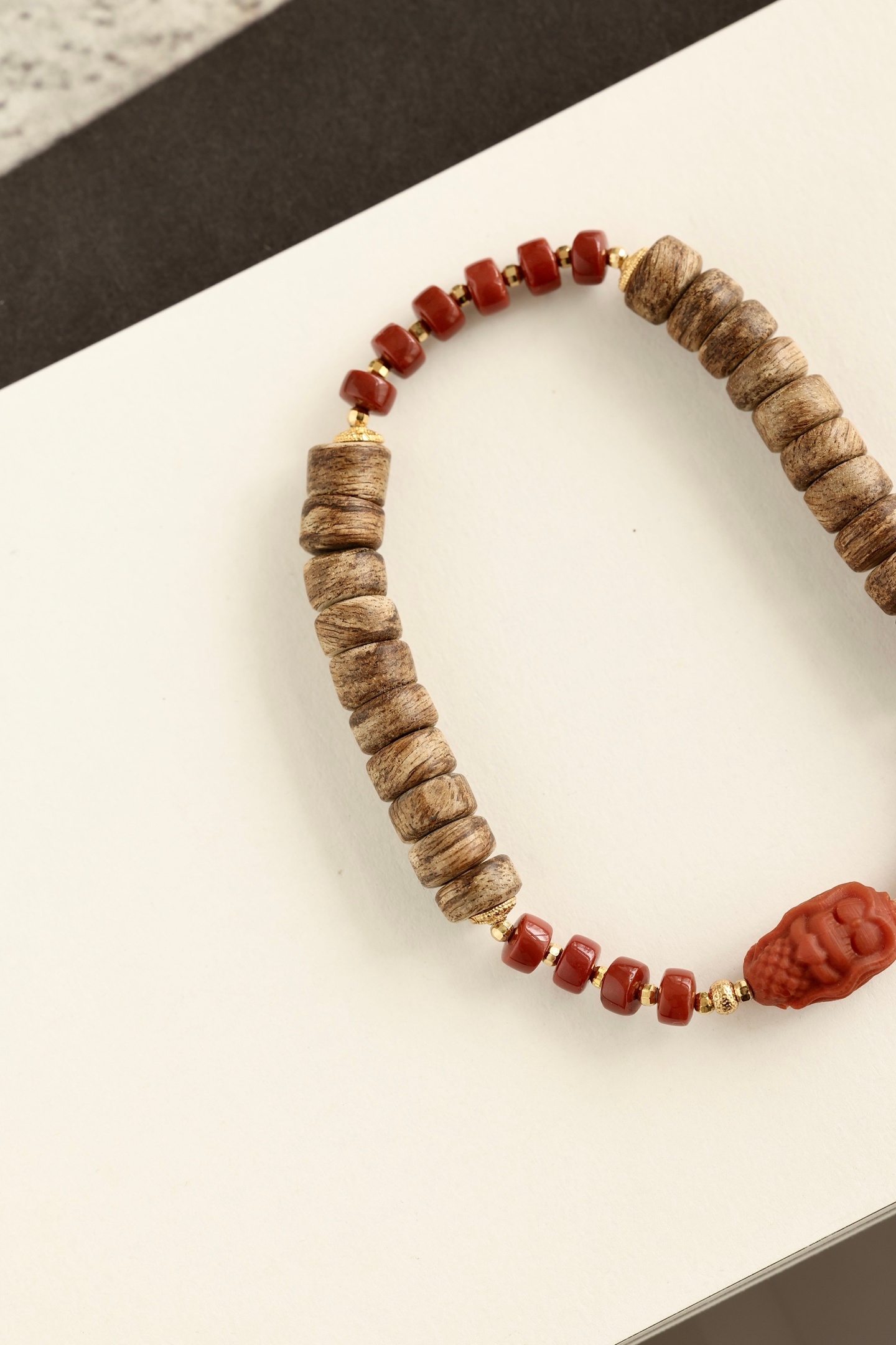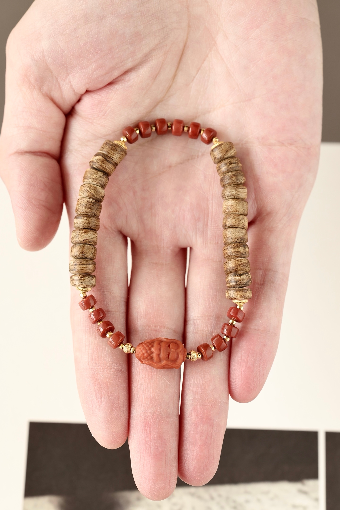 沉香油脂清晰,色泽温润,银鎏金配饰点亮其间。沉香清雅,南红美人鱼可爱有趣。佩戴于腕,香气随身,雅致可人。