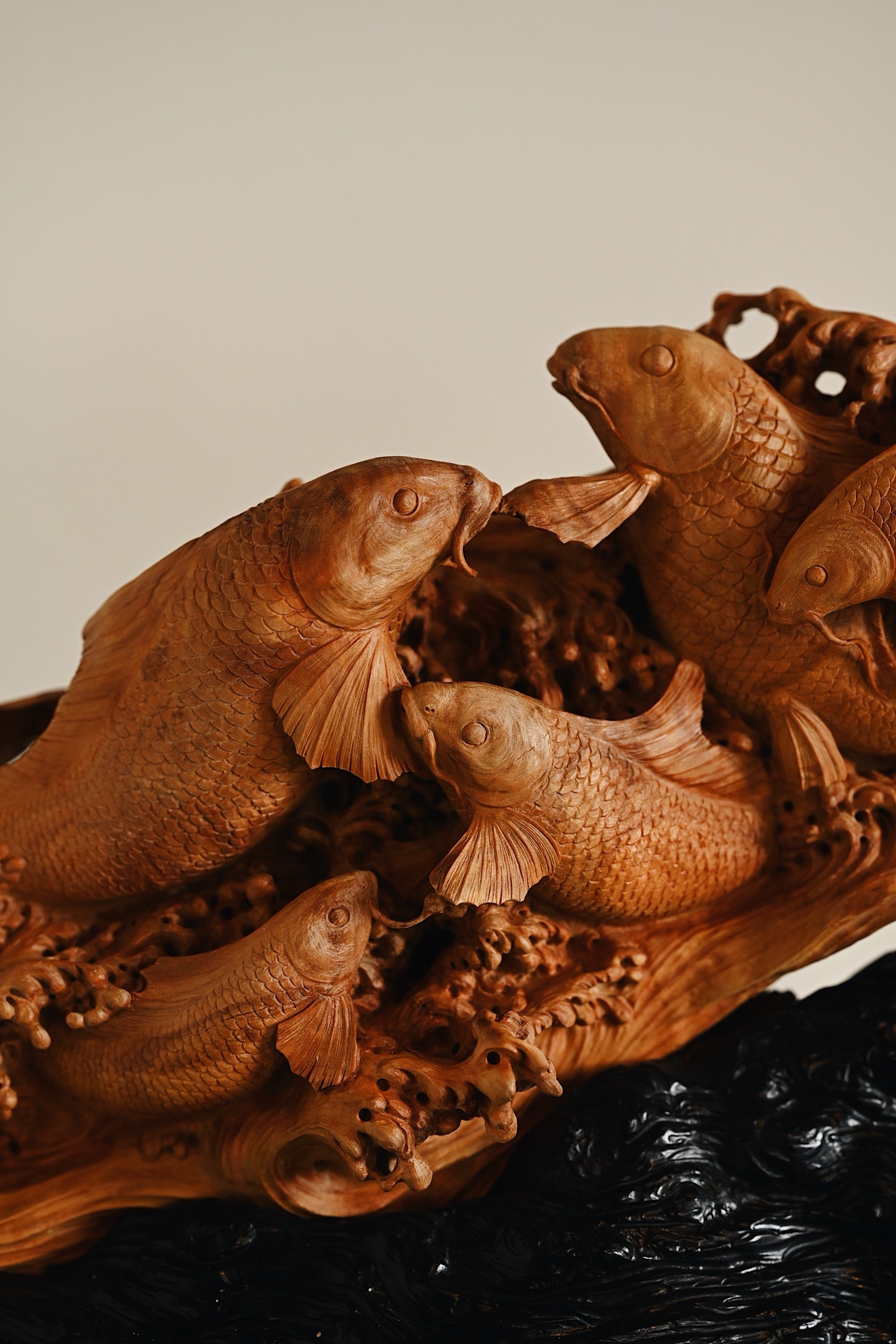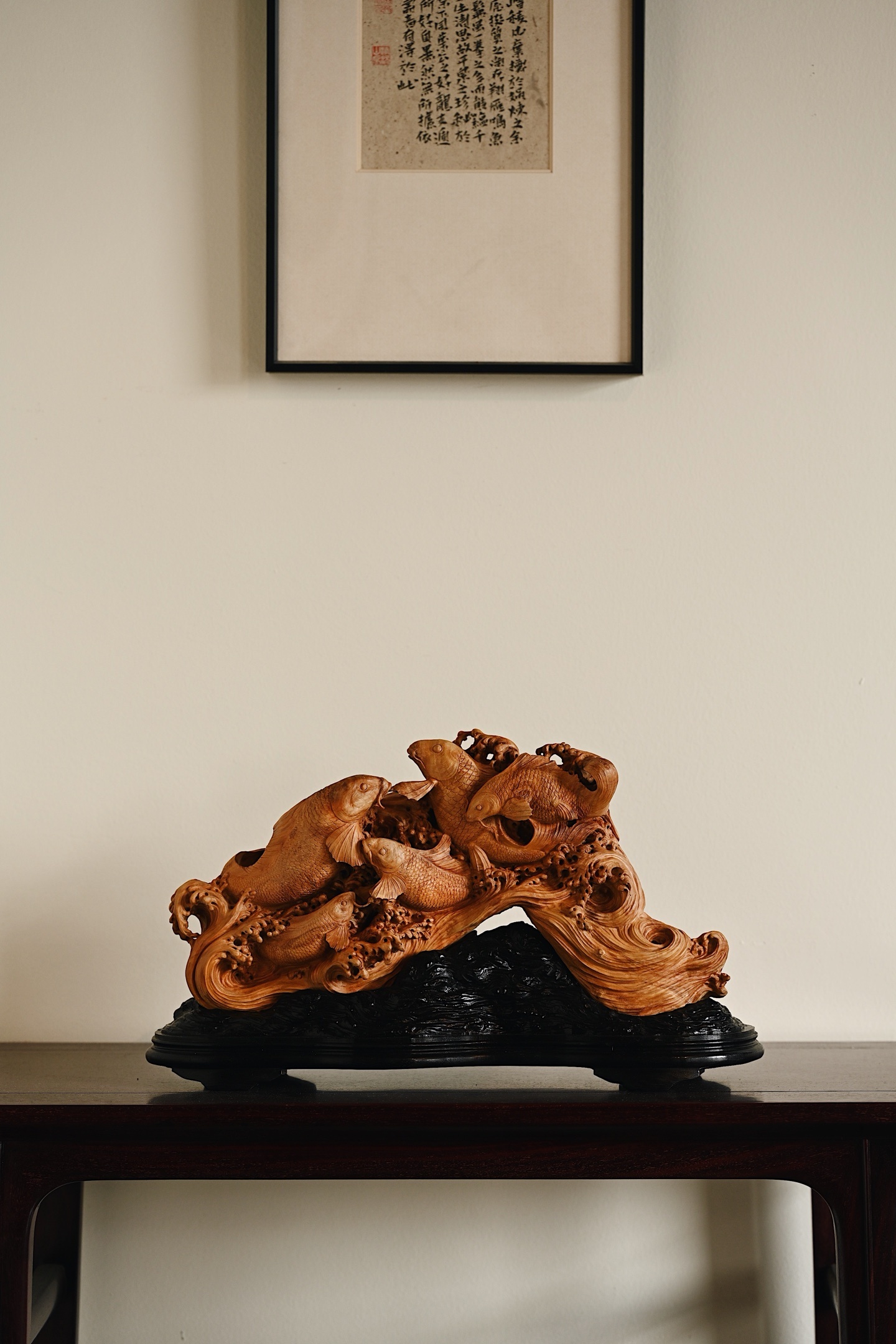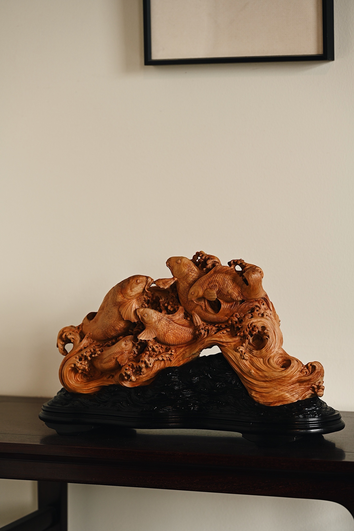 整料雕刻,依势雕就群鲤逐浪之态,鲤鱼鳞鳍分明,水波翻涌,五鱼齐跃,暗合“五福临门”“年年有余”之吉兆,陈设客厅、茶室,沉稳大气。