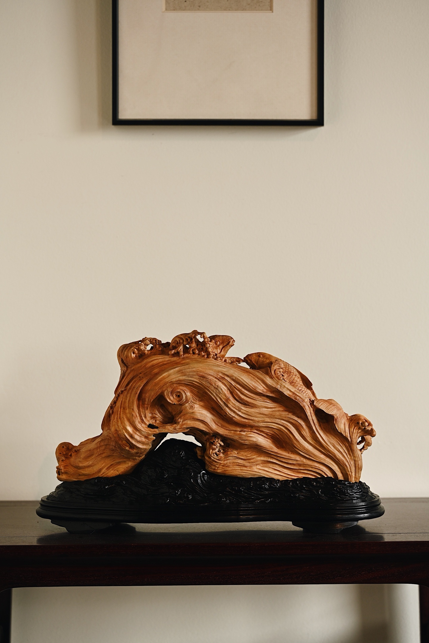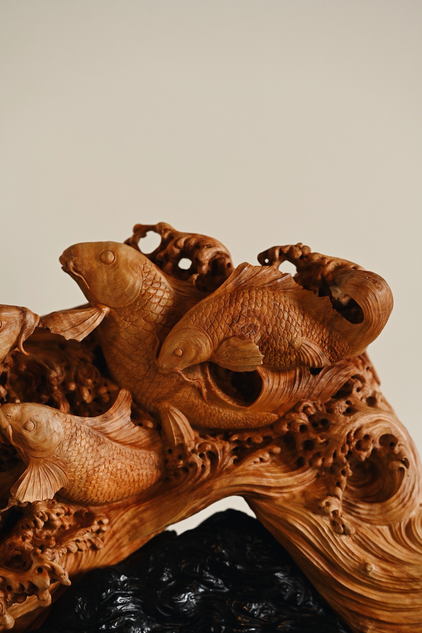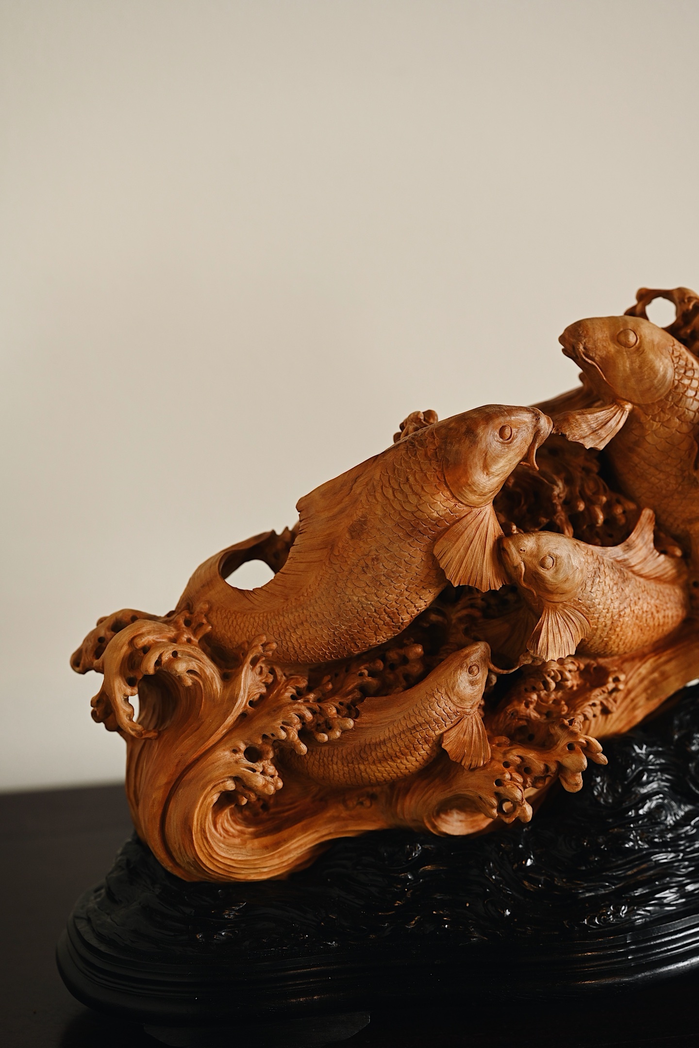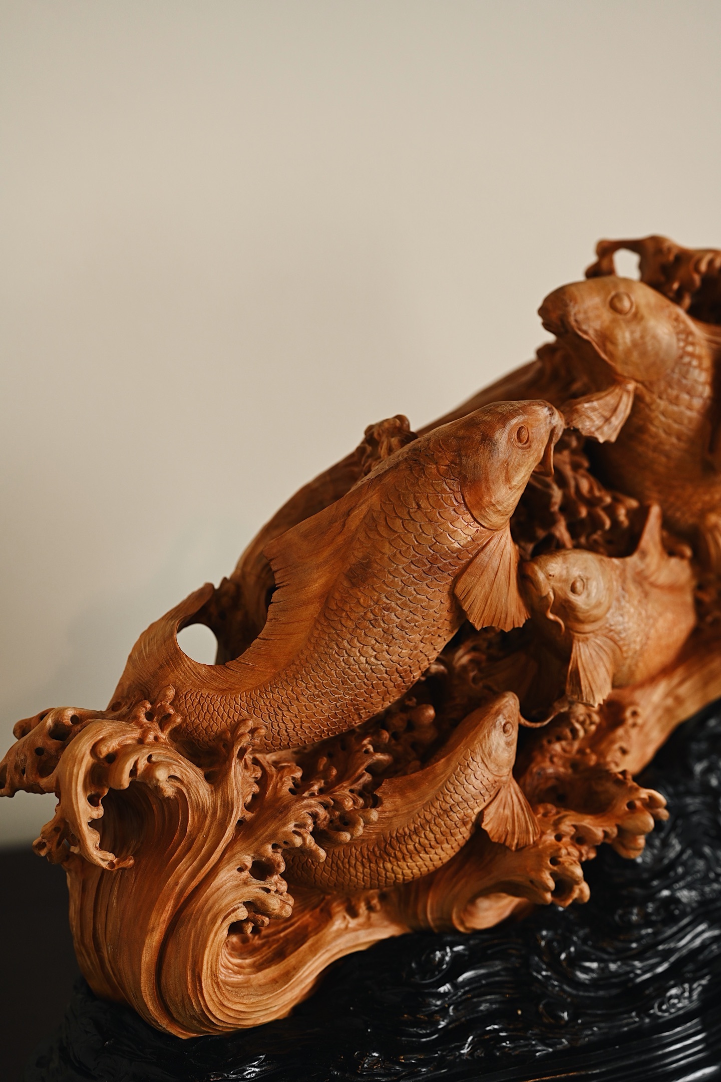 整料雕刻,依势雕就群鲤逐浪之态,鲤鱼鳞鳍分明,水波翻涌,五鱼齐跃,暗合“五福临门”“年年有余”之吉兆,陈设客厅、茶室,沉稳大气。
