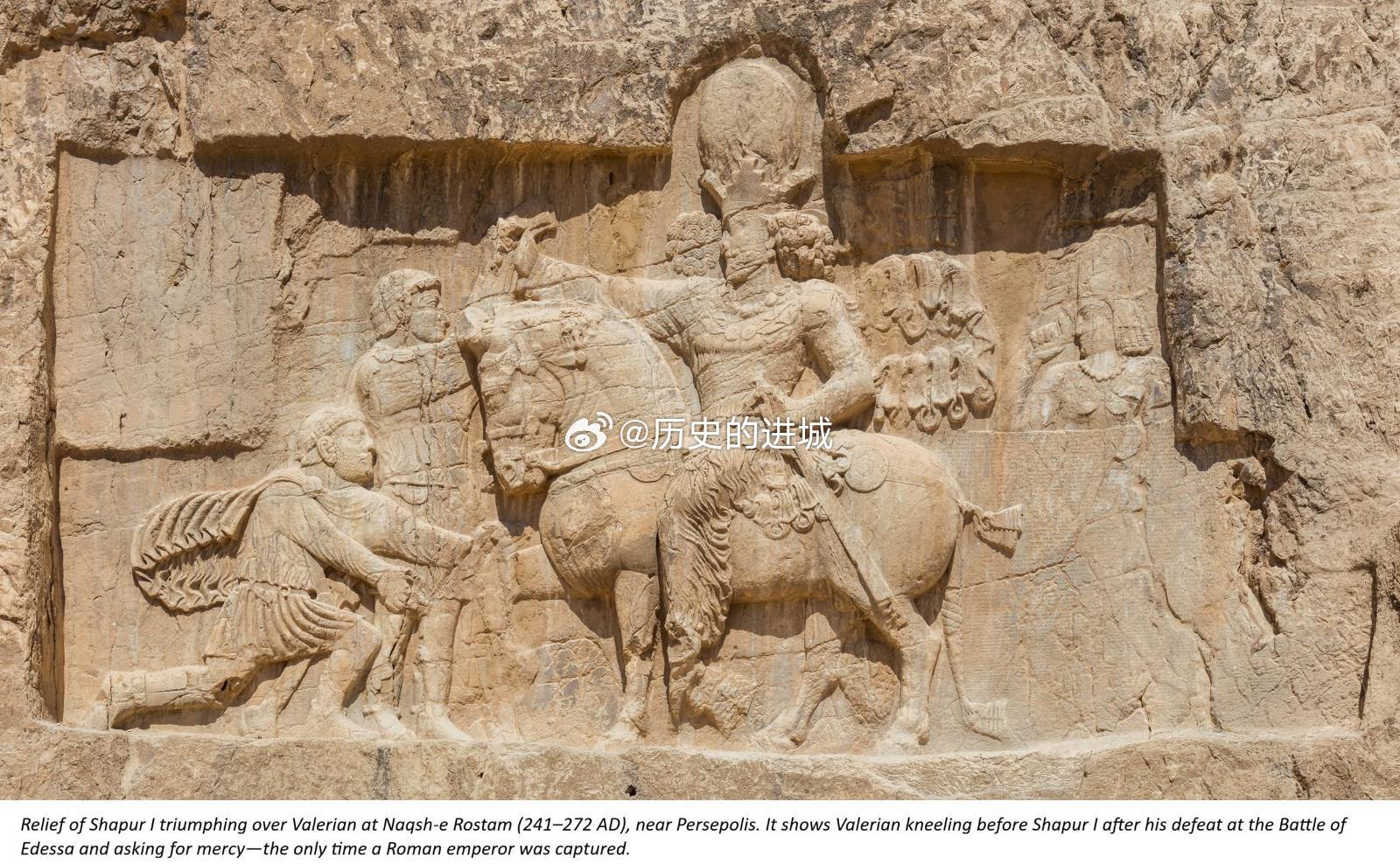 伊朗导弹在以本土砸出直径10米深坑伊朗外长阿拉格齐在社交媒体晒出古波斯萨珊帝国在公元260年,于埃德萨战役击败罗马俘虏皇帝瓦勒良的浮雕画。画中:萨珊帝国的沙普尔一世骑马,姿态高大,象征胜利与权力。而罗马皇帝瓦勒良跪地,身体前倾,表现臣服。