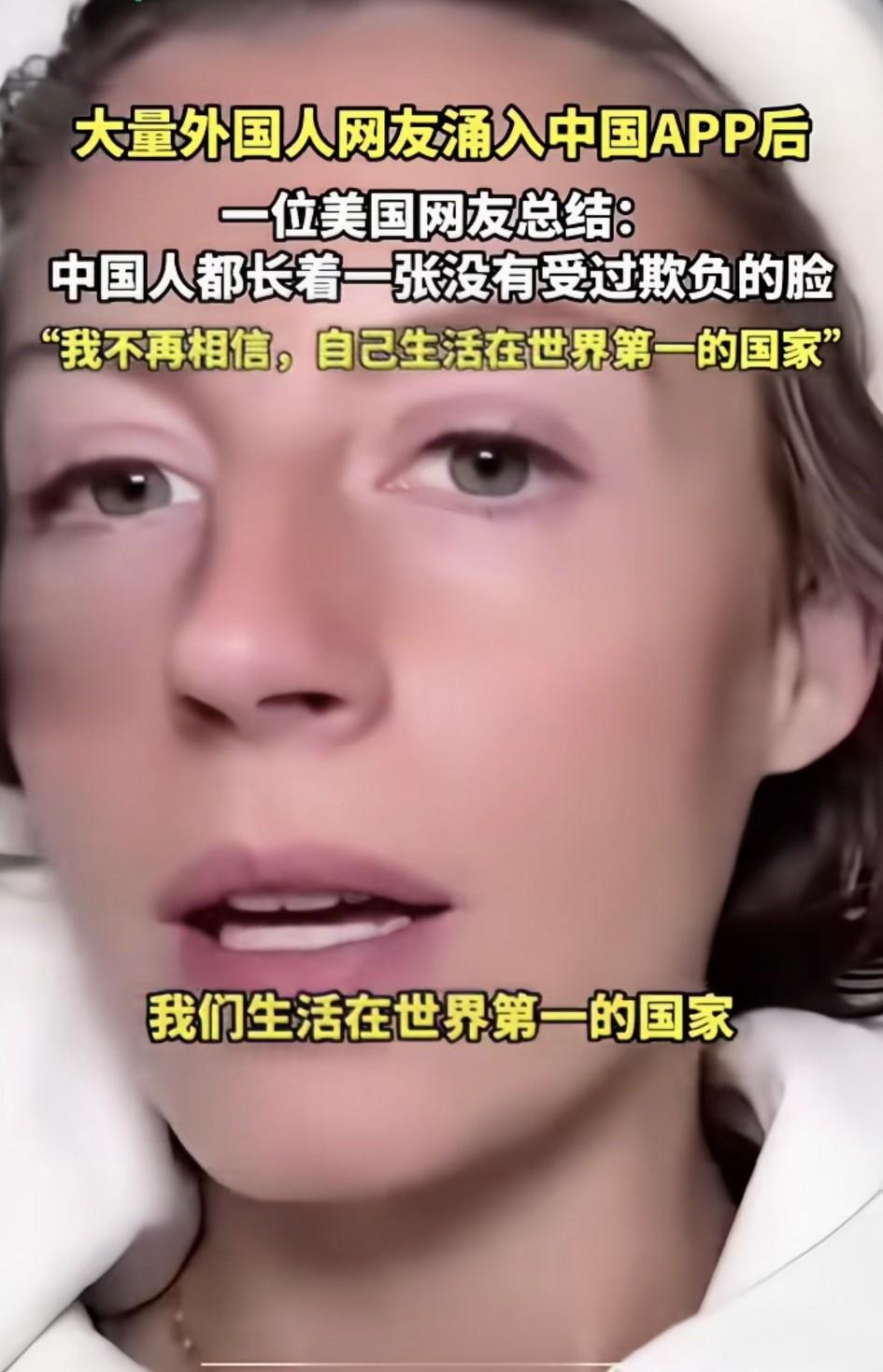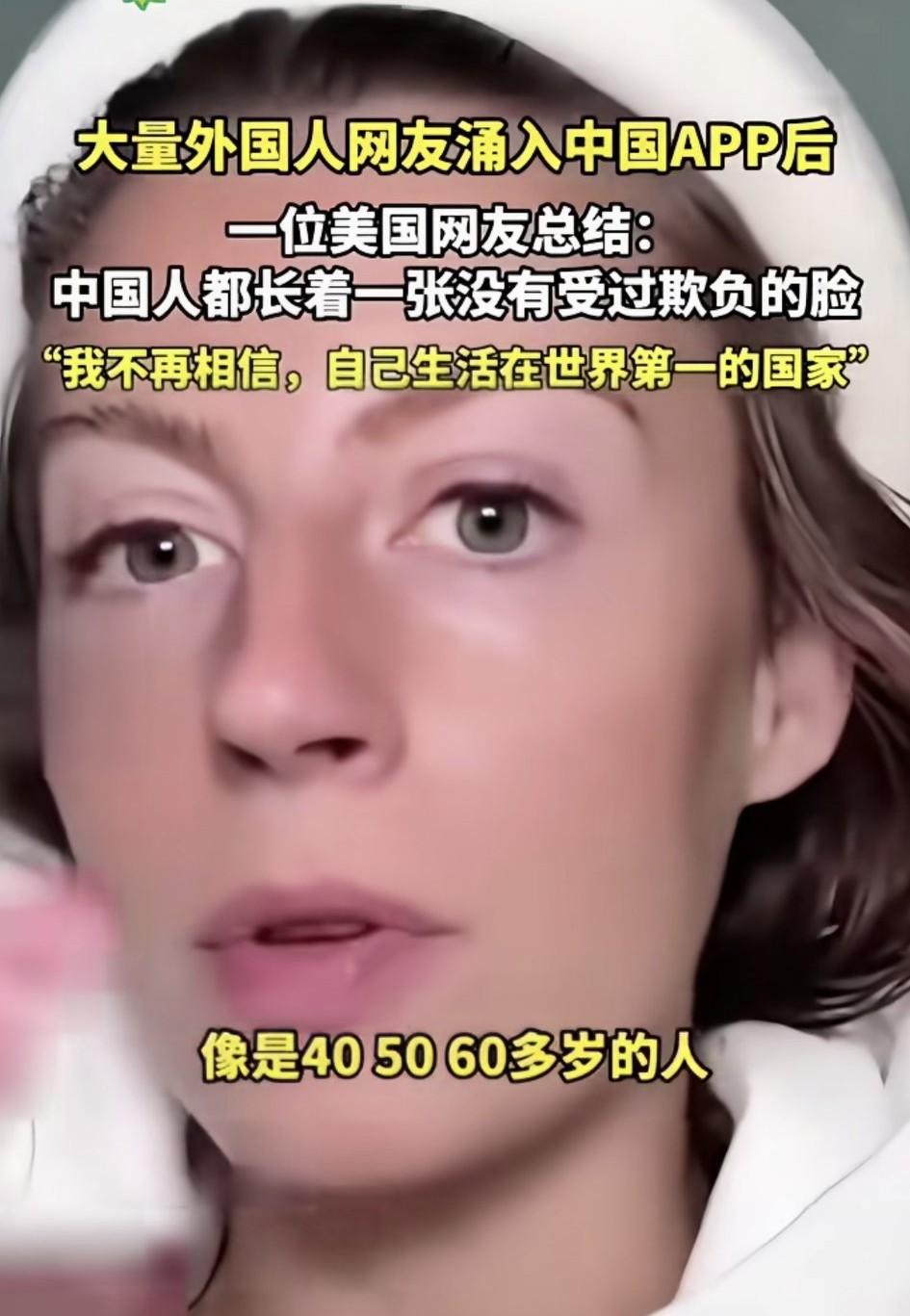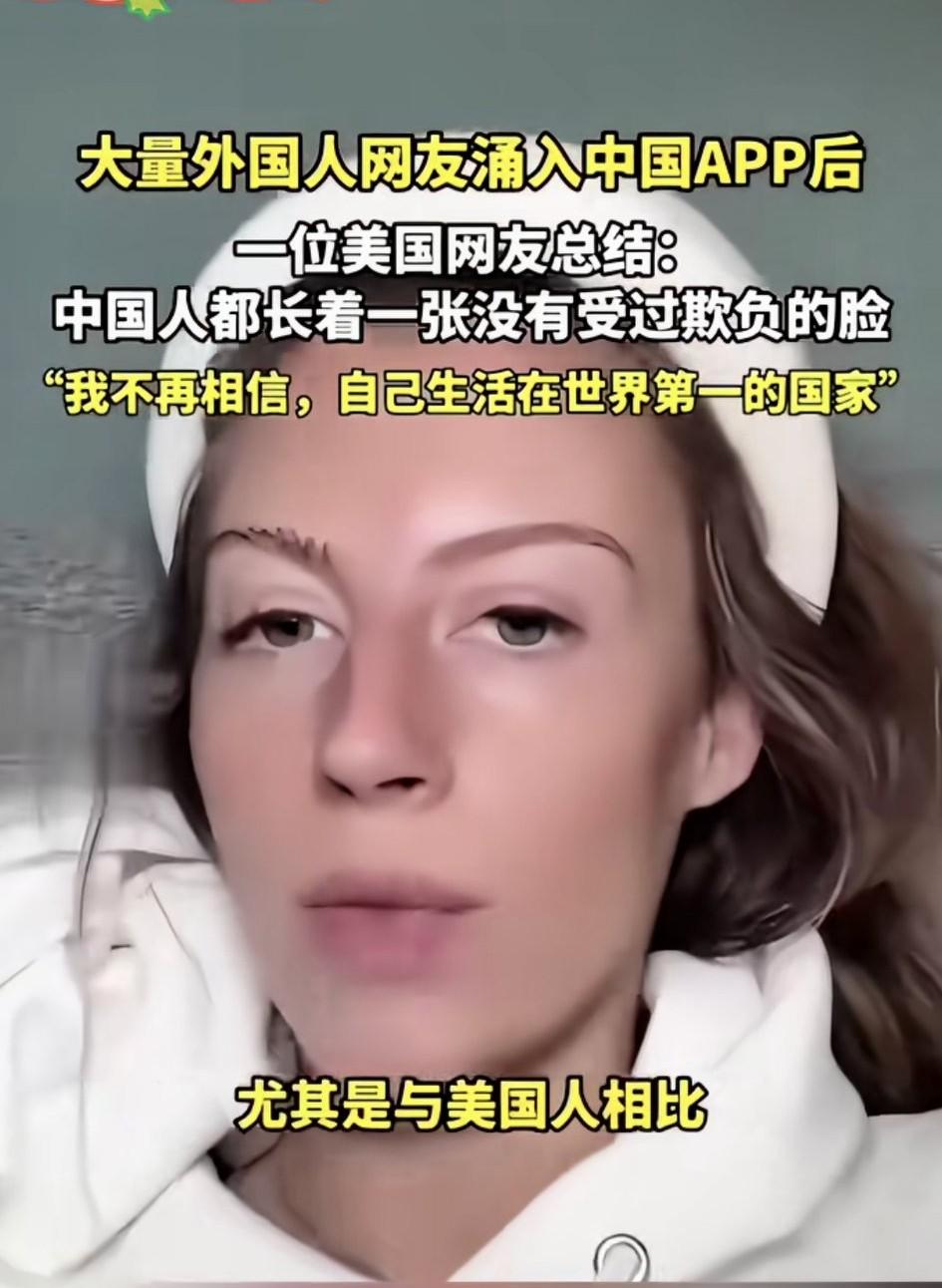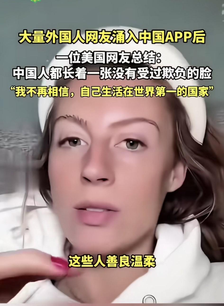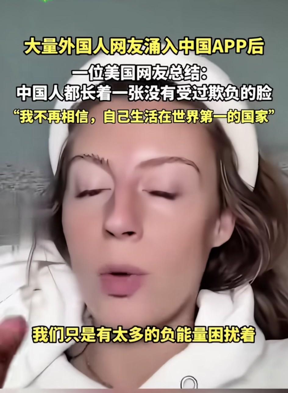 “长着一张没有受过欺负的脸!”这句话是当年某个中国人形容美国人的,没想到才过了几年,就有美国人把这句话送给中国人。 她说中国人大多温柔善良,还说不相信自己生活在世界第一的国家,他们被太多的负能量困扰着。 曾经某些书上,对着国外就猛夸,对国内就指责,没想到有一天情况相反了[大笑]