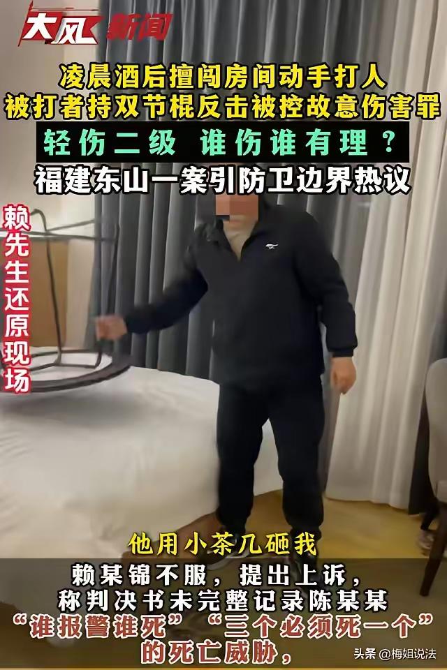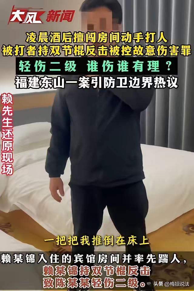 福建东山,赖某和员工出差住酒店,半夜2点左右,曾经的合伙人陈某突然闯进房间一脚把他踹翻,赖某从包里拿出双截棍反击,陈某受了伤。让人没想到的是,陈某仅仅被拘留了4天,赖某却因故意伤害罪被关了8个月。赖某不服,认为自己是正当防卫! 赖某是典型的广东人,个子很瘦小,看起来还没北方十几岁的小朋友高。 赖某虽然看起来小,却很能干,之前和几个朋友一起从福建东山县收篮子鱼往广东卖,生意做得不错。 这事搁谁身上都想不通。半夜两点,酒店房间门被踹开,一个1米8多的大汉冲进来把你踹翻在地,还喊着“今天你们三个必须亖一个”,你手里正好有根双截棍,你打不打?赖某打了,结果打人的关了4天,被打的关了8个月。 咱们先看看这两个人的体格差距。赖某1米63,瘦小得像个初中生;陈某1米8多,又高又壮。凌晨两点,对方喝了酒,一脚把赖某踹得嘴里出血,旁边两个员工根本拉不住。这种情况下,赖某从包里摸出健身用的双截棍反击,把陈某打成了轻伤二级。 一审法院认定赖某的行为“具有防卫性质”,但判了防卫过当,构成故意伤害罪。什么叫防卫过当?两个条件:明显超过必要限度,造成重大损害。重大损害指的是重伤或者死亡,陈某是轻伤二级,这算不算?法院认为算,因为手段比较重。 可咱们得问问,当时那个情境下,什么叫“必要限度”?凌晨两点,房间门被踹开,对方比你高出一大截,已经把你打出血了,还叫嚣着要弄死你。你拿根双截棍,能像武侠片里那样精准地只打胳膊不打头吗?法律上有个原则叫“防卫人优待”,就是不能站在事后用冷静理性的标准去评判一个正在挨打的人。 最高法、最高检、公安部2020年就出过指导意见,明确要求“充分考虑防卫人面临不法侵害时的紧迫状态和紧张心理,防止在事后以正常情况下冷静理性、客观精确的标准去评判防卫人”。这个案子,恰好撞上了这条规定。 再说说那个反差。陈某打人,只拘留4天,因为赖某伤情没达到轻微伤标准,走的是行政处罚。赖某还手,把陈某打成轻伤二级,触犯了刑法,走的是刑事程序。一个是行政拘留,一个是刑事拘留,两条轨道。可问题在于,如果赖某的行为被认定为正当防卫,那他根本就不该承担任何刑事责任。 更让人揪心的是,这个案子发生在2026年1月1日之前。新修订的治安管理处罚法今年元旦才正式实施,首次明确了正当防卫条款,告别了“被打还手即互殴”的老做法。赖某这个案子要是晚发生几个月,处理结果可能完全不同。 赖某现在还在上诉,坚持认为自己是正当防卫。他的律师肯定会抓住几个关键点:力量悬殊、对方酒后闯门、言语威胁、现场紧迫程度。这些因素加在一起,放在2020年两高一部指导意见的框架下,正当防卫的认定空间很大。 咱们普通人看这个案子,心里都憋屈。半夜被人闯进房间打,还手还要坐牢,这是什么道理?法律保护的到底是守法的人,还是先动手的人?赖某这个案子二审结果还没出来,大家都在等。等一个说法,等一个公道。 麻烦看官老爷们右上角点击一下“关注”,既方便您进行讨论和分享,又能给您带来不一样的参与感,感谢您的支持! 各位读者你们怎么看?欢迎在评论区讨论。
