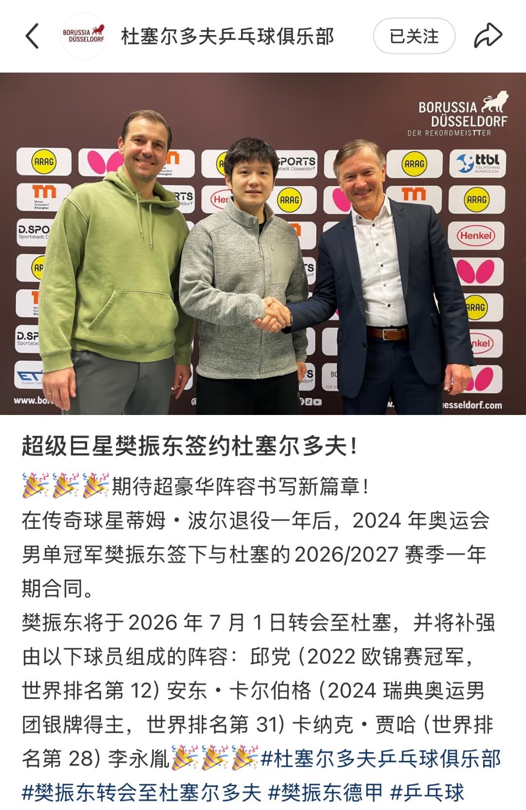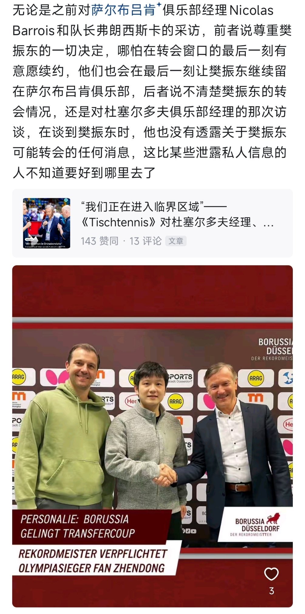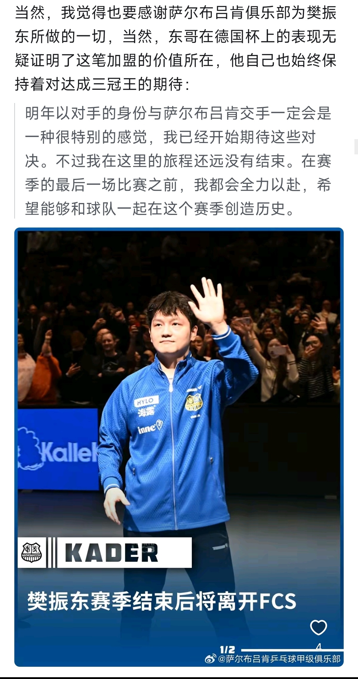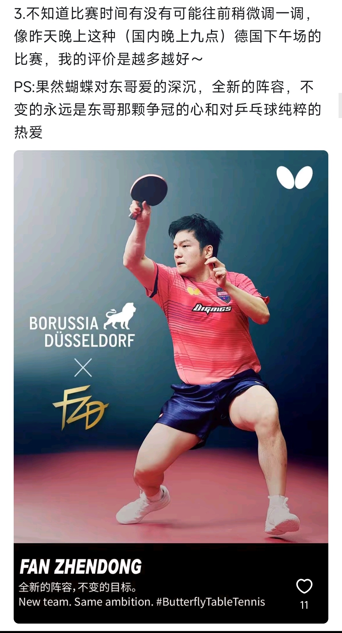 樊振东的这一动让欧洲乒坛再掀波澜,高层啥样咱不清楚,但在球迷这里不得了的反应了,动则变,变则精彩,不知赛果比赛才是最让人期待的。 果然蝴蝶对东哥爱的深沉:“全新的阵容,不变的永远是东哥那颗争冠的心和对乒乓球纯粹的热爱。”