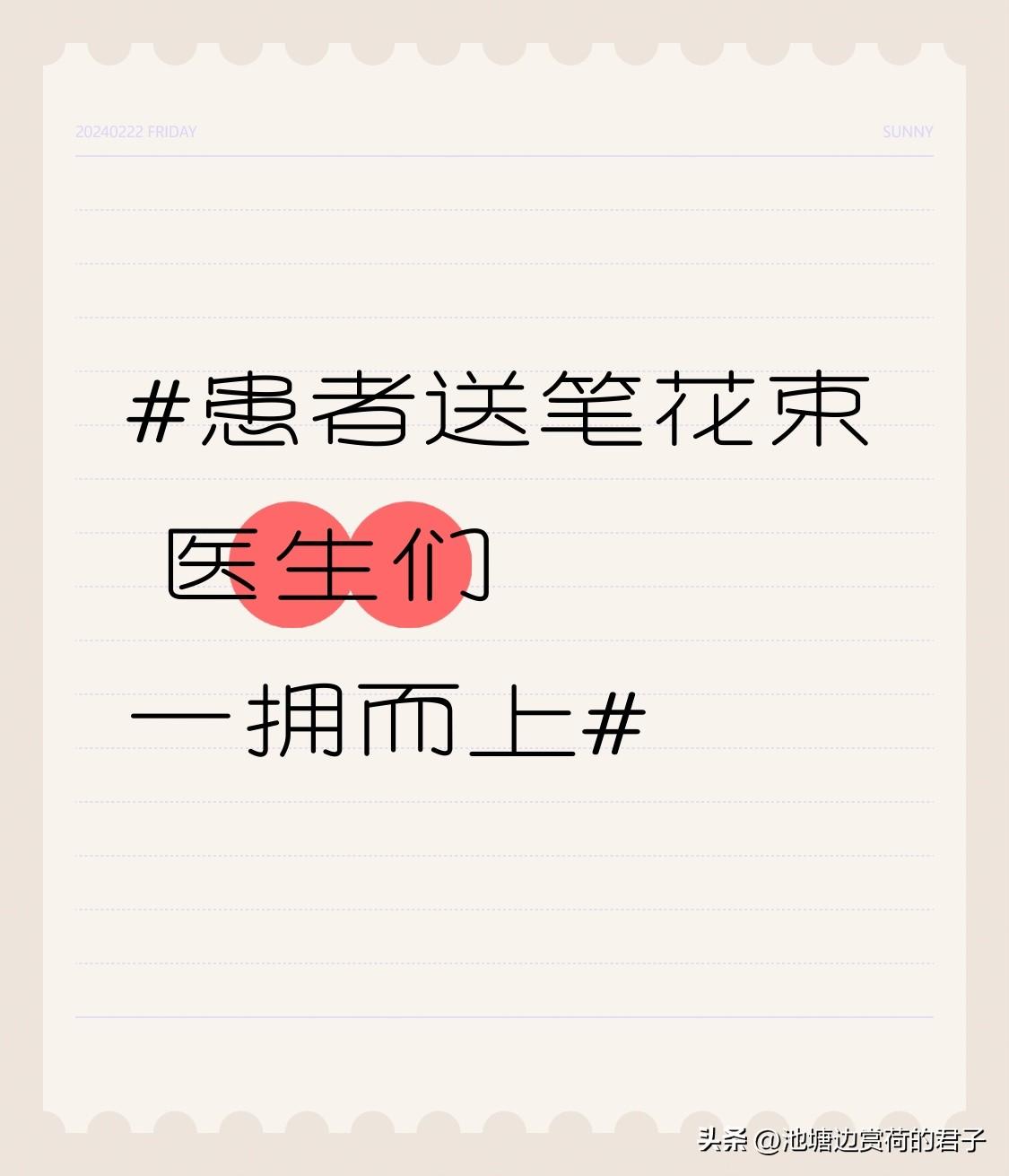 患者送笔花束 医生们一拥而上 患者送笔花束,医生们一拥而上,这画面太有爱了!某市第一医院,68岁的张建国老先生因心梗康复后,发起送笔花束活动。他觉得医生的笔是守护生命的“权杖”,鲜花易谢,笔却能长久。在他倡议下,病友们纷纷响应。 还有武汉的患者给蒋钰辉医生送中性笔花束。蒋医生说笔对医生很宝贵又易遗失,这礼物很用心。网友也说懂医生的才会送笔。对医生来说,笔就像战士的枪,这特别的花束满是患者的感恩,也让医生感受到职业荣耀,医患关系在这小小的笔花束中升温。