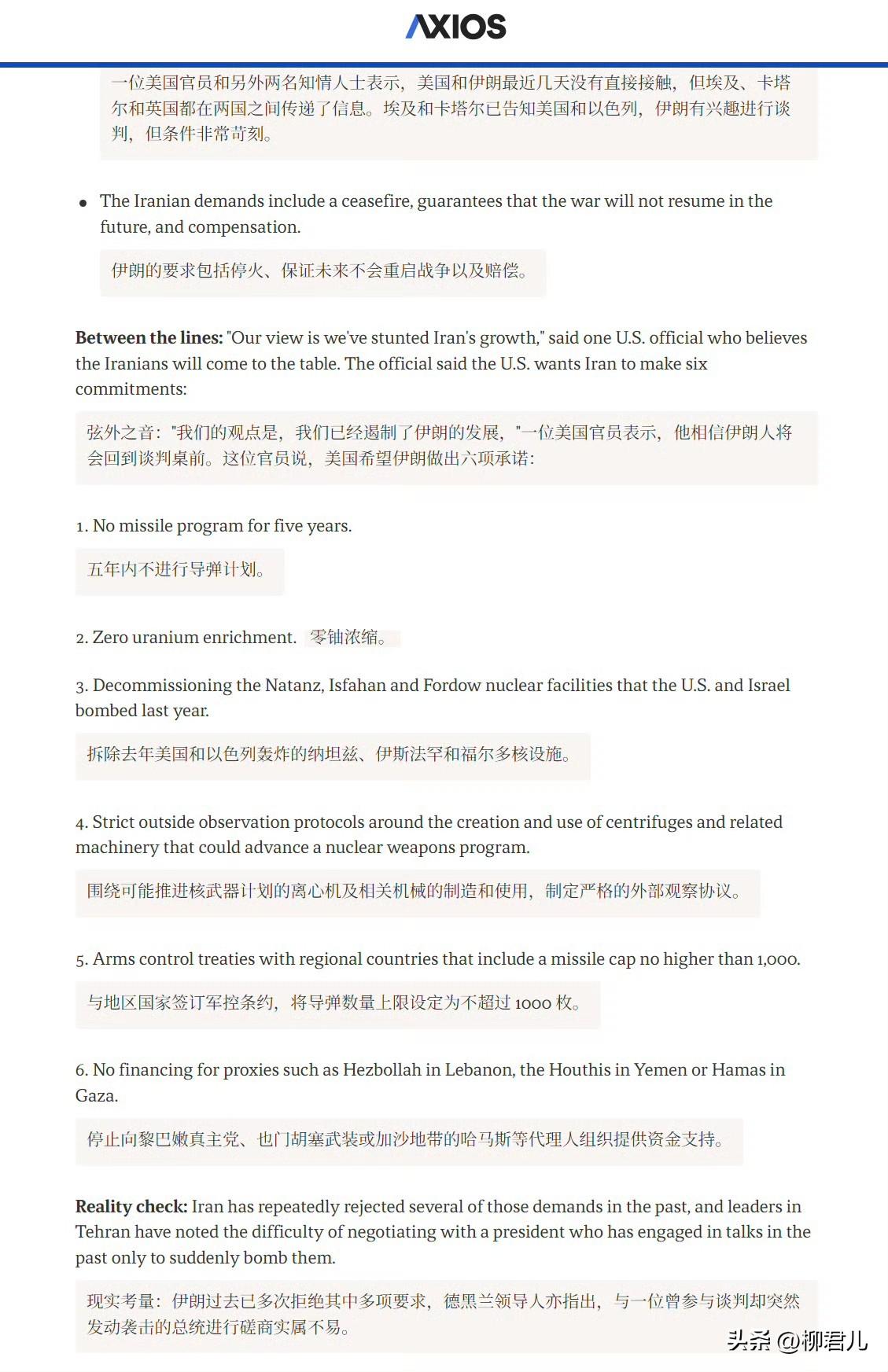 特朗普正在为“可能的停火”制定策略 据美媒Axios 报道,美以伊战事已持续3周,特朗普政府已经开始就下一阶段可能与伊朗的和平谈判进行初步讨论。 美国要求伊朗做出以下六项承诺: 1、五年内不进行导弹计划 2、完全停止铀浓缩,将浓缩水平降至零 3、拆除去年被美国和以色列轰炸的纳坦兹、伊斯法罕和福尔多核设施的反应堆。 4、对可能推进核武器计划的离心机及相关机械的制造和使用实施严格的外部监督协议。 5、与地区国家签订军控条约,导弹数量上限不得超过1000枚。 6、不得向黎巴嫩真主党、也门胡塞武装或加沙哈马斯等代理人提供资金支持。 有美国官员表示,特朗普政府现在面临两个问题,要弄清楚现在伊朗的实际决策者是谁,以及如何与他们取得联系。另外,如此苛刻离谱的停火条件,伊朗断然不会同意,可能只是特朗普的一厢情愿罢了。 —————————————————— 另据伊朗多家媒体报道,3月22日伊朗一名匿名官员接受电视台采访时表示,伊朗提出停战六项条件 1、保证战争不再发生 2、关闭美国在中东地区的军事基地 3、侵略方必须向伊朗支付战争赔偿 4、结束该地区所有战线的战事 5、为霍尔木兹海峡建立新的法律体系 6、审判并移交从事反伊朗活动的媒体人员。 同时该官员表示,基于当前军事态势,伊方认为近期不会停火,将「继续惩罚侵略者」,直至其「吸取历史教训」。 伊朗军方用实际行动警告美国和以色列,所谓的霸权与战争,无法让伊朗屈服,美国和以色列不付出任何代价,想全身而退,根本不可能。
