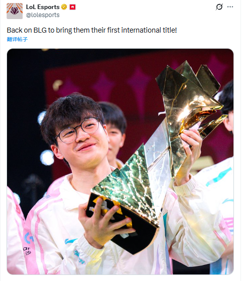 LOL官推分享Xun捧杯照:重回BLG帮助队伍赢得首个国际赛冠军