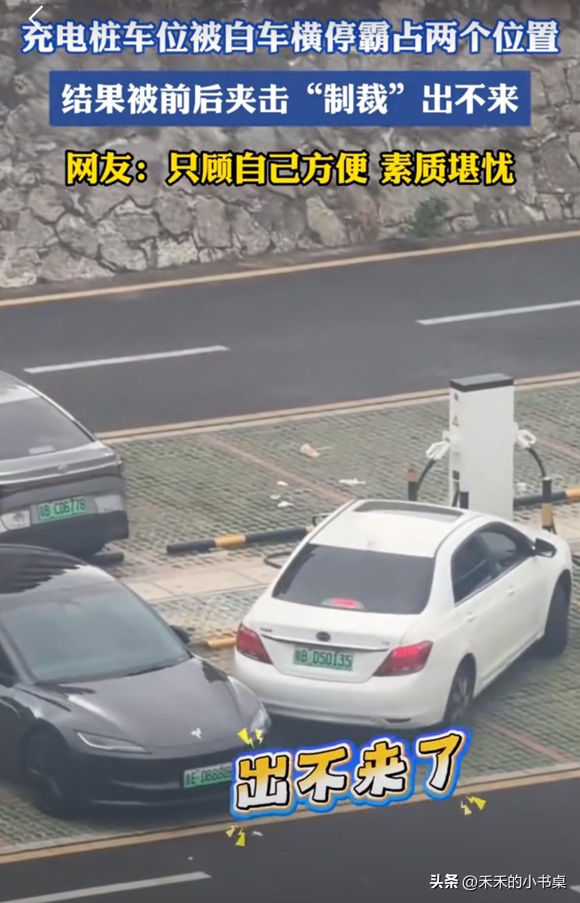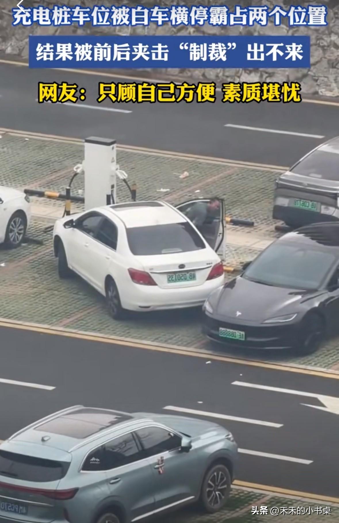 解气!对付这种没素质的人就应该这样。 白车男子给车充电,占两个车位,黑车男子气不过,直接把车停在白车屁股的位置。 结果,白车受到了前后夹击,出不来了! 对这种没素质的人,就应该让他多着急一下。 网友说:“只顾自己方便,素质堪忧!” 其实社会上有很多没素质的人,你还拿他没办法,我支持黑车大哥的做法。