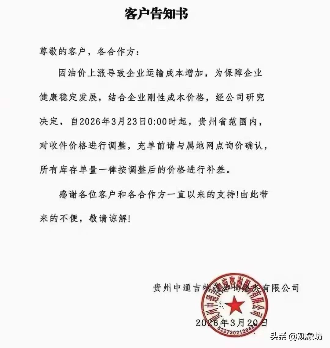 油价一夜狂飙,快递费悄悄涨价:普通人的钱包,正在为这场“蝴蝶效应”买单 今天,3 月 23 日的深夜,加油站的灯光一定比夜市还亮。车主们一定排着长龙,只为在零点前薅最后一波羊毛。因为过了今晚,92 号汽油将全面迈入"9 元时代”,柴油涨幅更是凶猛。但这不仅仅是一场车主的狂欢或哀嚎,一场关乎你我柴米油盐的“隐形风暴”,正随着车轮滚滚而来。 表面看,这是物流成本的传导;实则,这是普通老百姓生活账本上的一次“被动缩水”。 第一张倒下的多米诺骨牌,是快递费。 就在油价飙升的当口,贵州、四川、浙江义乌等地已率先行动。中通、圆通、申通等巨头集体调价,面单费上涨,特件优惠取消,发往北上广的快件甚至每票加收 1 元。别小看这几毛钱、一块钱的涨幅,对于习惯了"9.9 元包邮”的我们来说,这意味着低价时代的终结。商家不是慈善家,运费涨了,要么商品涨价,要么包邮门槛提高。以前随手买的零食百货,如今可能要多掏几块钱运费,积少成多,每个月的生活支出就这样悄无声息地增加了。 第二张被推高的账单,是菜篮子。 物流是城市的血管,油价就是血液里的“胆固醇”。一辆重载卡车跑一千公里,油费要多掏三四百。这笔钱最终去哪了?进了蔬菜的进价里。北京社区超市的阿姨无奈直言:“外地菜进价每斤涨了三四毛,菠菜从 3 块 8 涨到了 4 块 2。”你不去开车,不代表你能躲过涨价。从田头到餐桌,每一斤青菜、每一块猪肉,都沾上了高油价的“税”。 更无奈的,是那些夹在中间的普通人。 出租车师傅喊着要涨起步价,不然“喝西北风”;外卖小哥抱怨电池配件涨价,配送费却难跟着涨,只能多跑几单硬扛;而最无助的消费者,面对这一切只能默默接受。我们以为自己不加油就与世无争,殊不知,油价这只“蝴蝶”扇动翅膀,刮起的是整个生活成本的飓风。 从快递费到菜价,从打车难到日用品普涨,高油价正在重塑我们的消费逻辑。在这场宏大的成本博弈中,大企业或许能通过技术优化、规模效应来缓冲,但普通老百姓,除了精打细算、压缩开支,似乎别无他法。 这一轮涨价,没有赢家。它像一面镜子,照出了民生经济的脆弱,也照出了普通人在时代洪流中的身不由己。当“活着贵了”成为调侃背后的现实,我们只能希望:成本涨了,服务别降;日子紧了,人心别凉。毕竟,在这条连锁反应的链条上,没有人能独善其身。油价爆发 国际油价巨震 闻油价涨涨 油价传导 油价涨生活贵 油价价格走势
