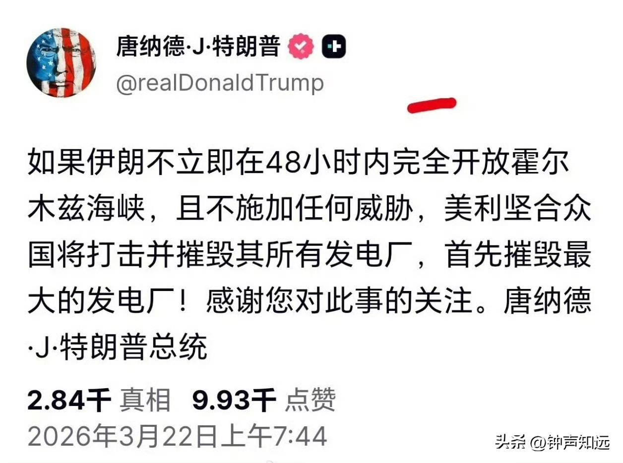 伊朗发表最新声明:一切责任在美以。相比【推特治国】伊朗更像个大国。 3月22日伊朗外交部发布关于霍尔木兹海峡航行安全的官方声明,重点可总结为五点。 一、责任完全在美以。 二、伊朗行为是合法自卫。 三、海峡未封锁,交通未断。 四、通行规则:精准反制、区别对待。 五、伊朗是负责任的,尽力降低地区风险。 在声明里伊朗没有空泛的威胁,只有基于国际法的清晰主张。 阻止侵略者利用霍尔木兹海峡实施对伊侵略,是伊朗行使固有自卫权的正当行为,天经地义、不容置喙。 同时伊朗也展现出十足的【理性与责任】,不仅明确霍尔木兹海峡从未被封锁、海上交通从未中断,还划定了清晰的通行规则,只要是非敌对、未参与反伊行动的国家船只,遵守安全规定并经伊朗主管当局协调后,可安全通过。 而美以及其同谋直接被拒之门外。为避免波及无辜海员与船舶,伊朗还提前采取了一系列预防性措施,最大程度降低地区海域的叠加风险,把对地区航运的影响降到最低,在强硬反制与兼顾地区利益之间,拿捏得恰到好处。 这与某些国家的“推特治国”形成了鲜明对比,动不动就在社交平台口嗨式放狠话、毫无章法地发布威胁性言论,不靠正式的外交声明、不依循国际法准则,只凭一时意气的表态不断加剧地区局势动荡,既没有明确的行动准则,也不顾及国际社会与地区各国的正当利益。 而伊朗以官方声明的形式定调立场,以具体的规则明确边界,以负责任的举措规避无辜风险,一言一行皆有章法,一举一动皆有考量,没有虚张声势的表演,只有实实在在的态度和行动。 这份声明不仅是对美以军事挑衅的反制,更是对地区各国的明确说明,让国际社会看清了局势的始作俑者,也让世界看到了一个在复杂局势中,始终保持清醒、坚守责任的伊朗,这样的表现远比靠社交平台博眼球的“推特治国”更配得上大国两个字,也真正展现出一个大国应有的格局和风范。