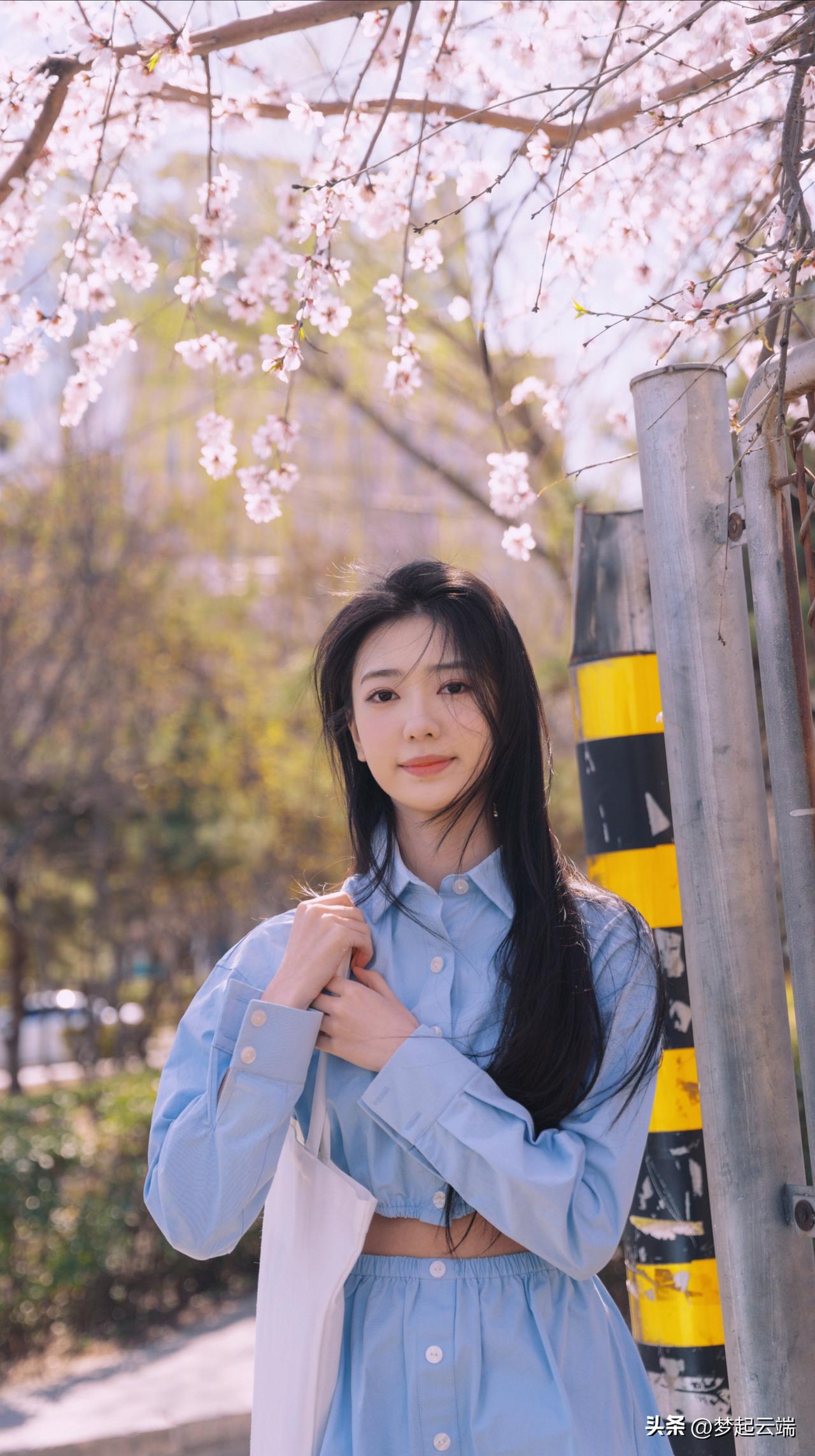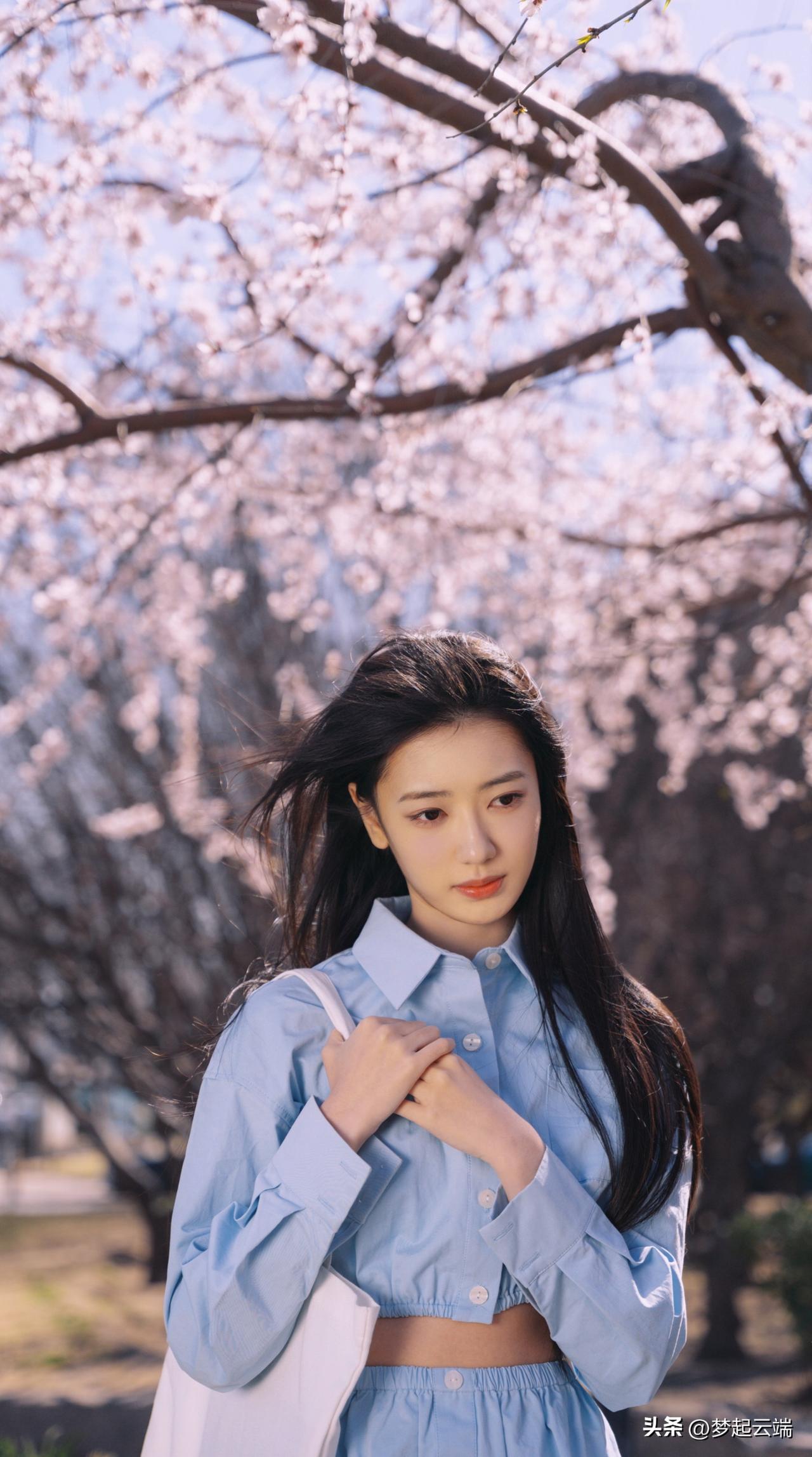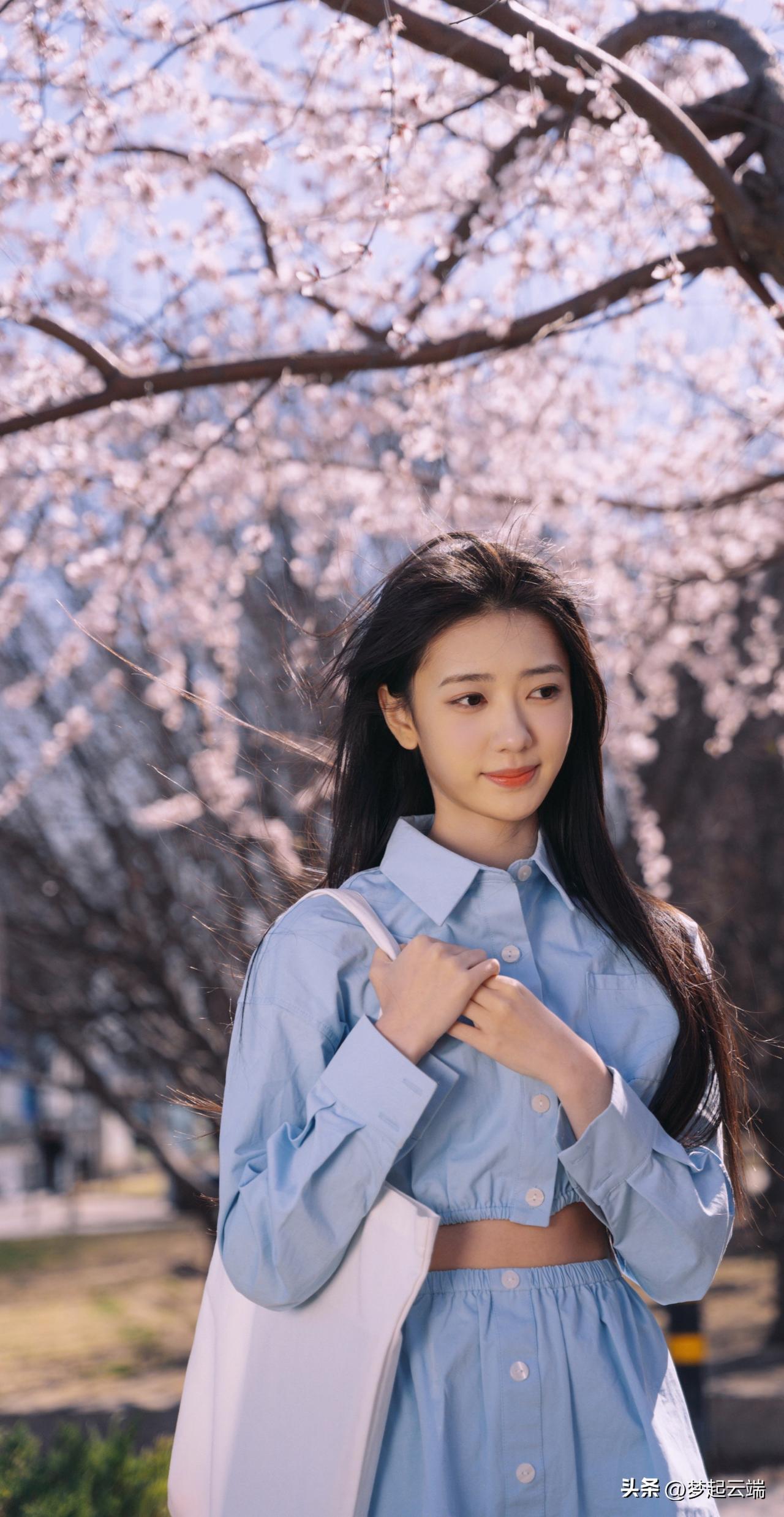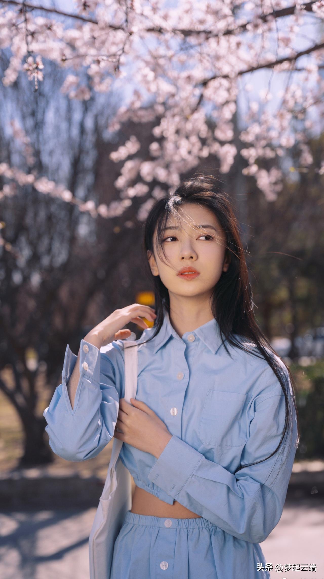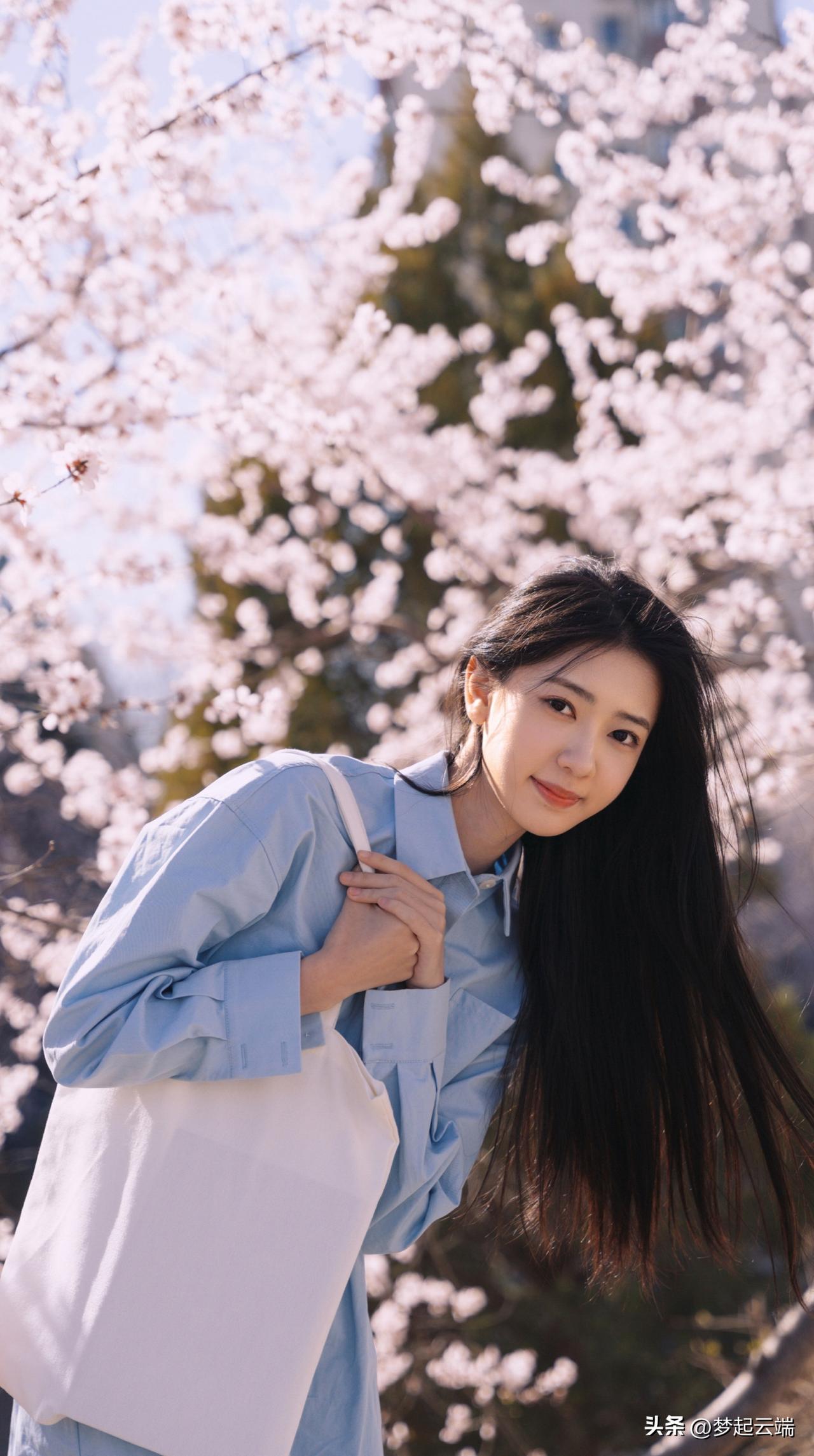 樱花树下,少女轻抚发梢,浅笑盈盈,春日气息扑面而来。