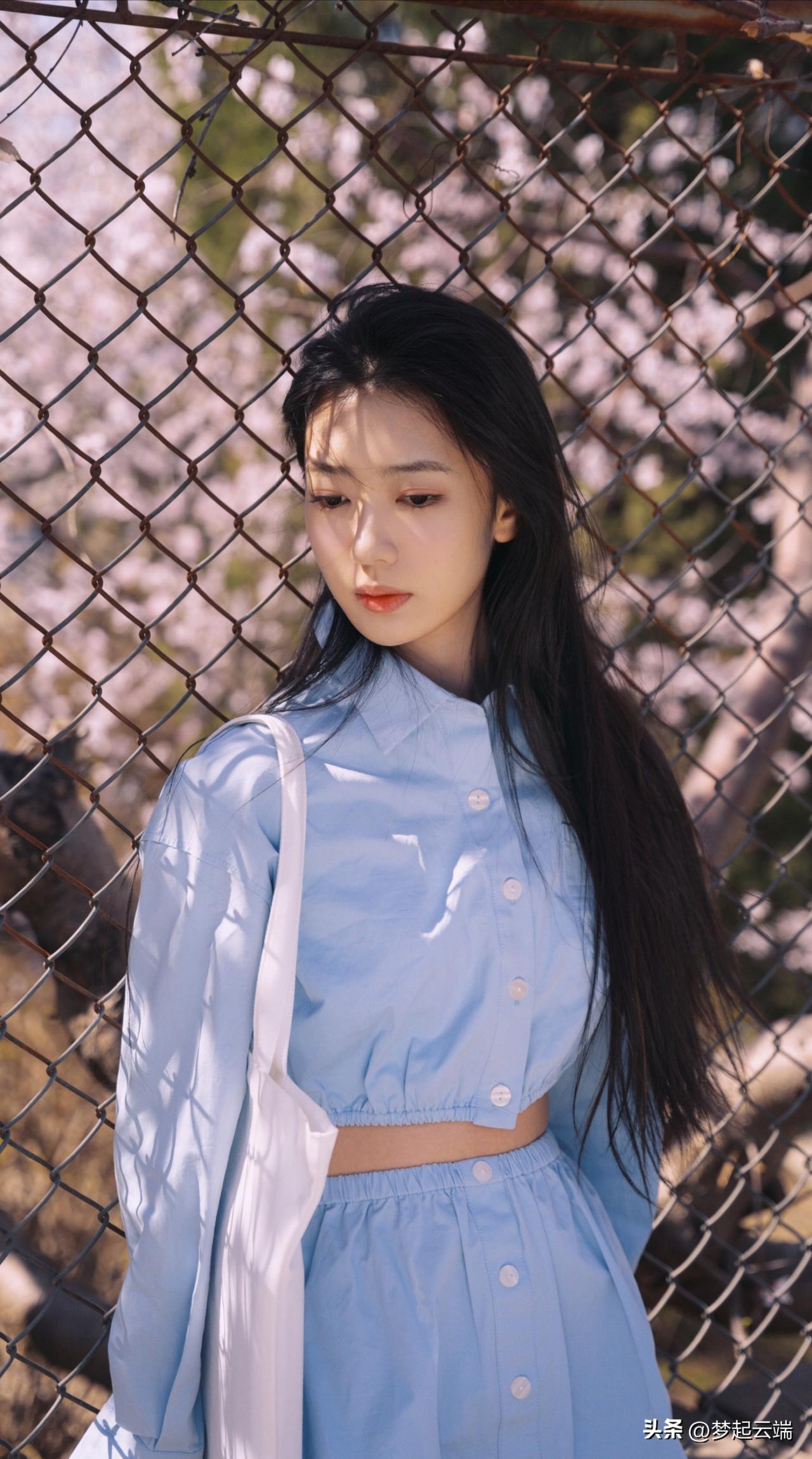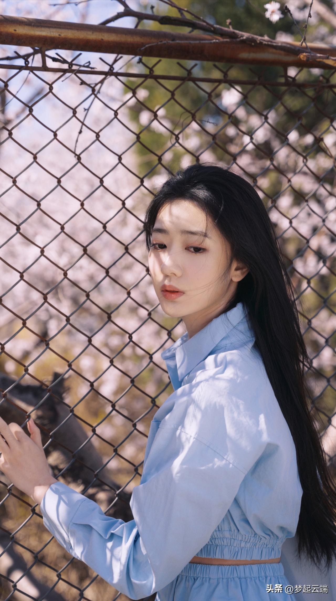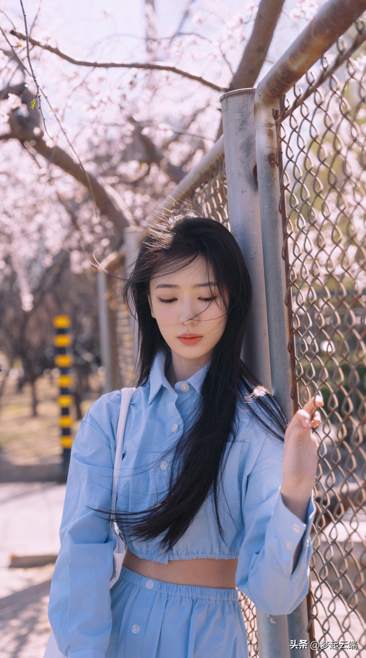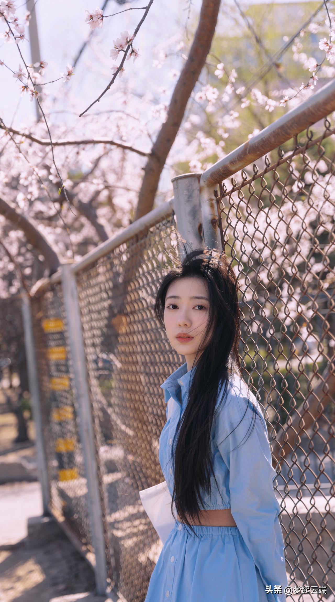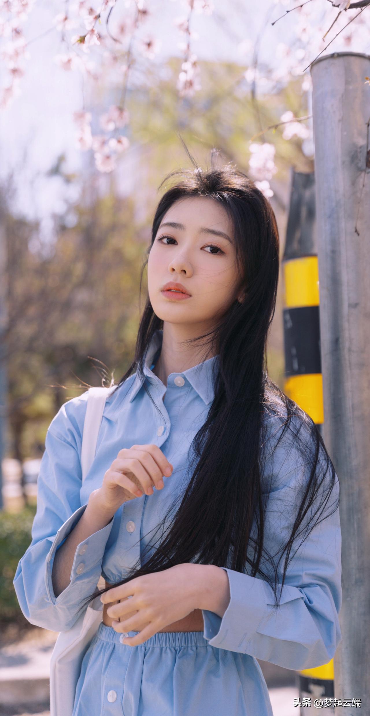 樱花树下,少女轻抚发梢,浅笑盈盈,春日气息扑面而来。