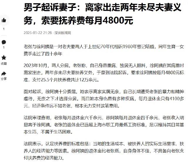 上海,老张和徐阿姨这对老夫妻,年轻时相识结婚,还生了个闺女。可谁能想到,都过了大半辈子,两人却闹起了分居。老张说自己病重,徐阿姨却离家出走两年多,没尽扶养义务,老张起诉索要每月4800元,共计25.5个月、122400元的扶养费。徐阿姨这边也有苦水,说自己长期遭老张打骂,分居实属无奈,而且自己一身病,退休金才四千多,根本拿不出钱。最终被法院驳回全部诉求。 据深圳新闻网2026年3月22日报道,这场官司在虹口区人民法院审的。老张和徐阿姨都是七十多岁的人了,1980年结的婚,风风雨雨四十多年。谁能想到,白头偕老没等到,等来的是对簿公堂。 老张在法庭上说,自己一身病,独居没人管。老伴徐阿姨2023年10月就搬走了,一走就是两年多。在他最需要人照顾的时候,身边连个端茶倒水的人都没有。他觉得自己被抛弃了,心里又寒又气。这才一纸诉状,要求徐阿姨按每月4800块的标准,补上这二十多个月的“扶养费”,加起来十二万多。 徐阿姨坐在被告席上,眼泪直往下掉。她说自己不是不想管,是不敢管,也管不动了。这么多年,老张的脾气一点就着,动手打骂是常事。她身上这病那痛,好多都是长期精神压抑、担惊受怕落下的。2023年那次,实在是受不了了,才收拾几件衣服,从家里逃了出来。分居,是她能想到保护自己的唯一办法。 她还说,自己每月退休金就四千一百多块,看个病吃个药就花去大半,日子也不好过。老张每月退休金六千多,比她宽裕多了。她哪还有能力反过来给老张钱? 法院认为老张每月六千多退休金,在上海生活,完全够用,甚至还有结余,根本谈不上“生活困难”。法律规定的扶养义务,是让有能力的人去帮助真正需要帮助的人,不是让经济更弱的一方去补贴相对强的一方。 夫妻相互扶养,得看实际情况,徐阿姨收入更低,自身多病,不具备支付这笔扶养费的经济能力。老张的诉求,于情于理于法,都站不住脚。最终,法院驳回了老张的全部诉讼请求。 少年夫妻老来伴,本该是互相搀扶着走完最后一段路。可有些婚姻,熬过了柴米油盐,却没熬过晚年的孤独和怨怼。一方觉得被抛弃,另一方觉得被伤害,都觉得自己委屈。 当婚姻里出现了长期的矛盾,被迫分居的一方,难道还要为“未尽扶养义务”而买单吗?法律给出了否定的答案。扶养是责任,但不是无条件的枷锁。它建立在婚姻存续的基础上,更建立在双方实际的经济能力和生活状况上。 老张也许确实需要人照顾,但他的困境,不能成为向一个同样脆弱、且曾受他伤害的老伴强行索取的借口。真正的“伴”,是心与心的依靠,不是一张扶养费判决书。这场官司,没有赢家。两个老人,一个赢了道理却输了人情,一个摆脱了诉累却仍要面对晚景凄凉。 婚姻这本书,开头总是甜蜜,结局却各不相同。但愿每一对夫妻,都能在岁月里学会珍惜,学会沟通,别让本该相濡以沫的晚年,变成一场冰冷的算计。 各位读者你们怎么看?欢迎在评论区讨论。