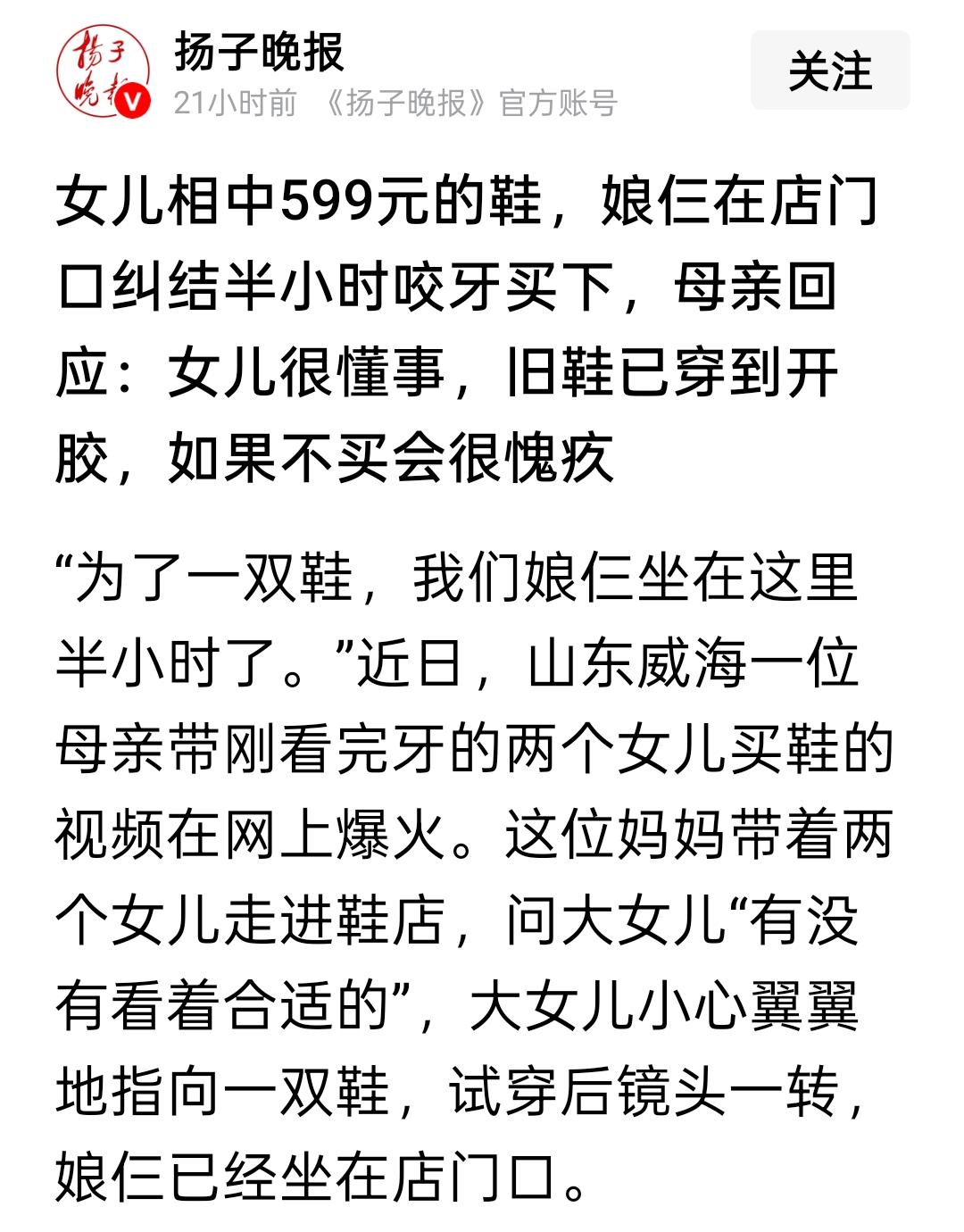 女儿相中一双599元的鞋,娘仨在店门口纠结半小时后才咬牙买下,你可能永远也不会知道,这位母亲的内心经过了怎样的斗争。 山东威海,一位头上已经长出白发的妈妈,带着刚看完牙的两个女儿去买鞋。大女儿在店里看了一圈,小心翼翼地指了一双鞋,试穿后特别喜欢。 可镜头一转,娘仨已经坐在了店门口,一坐就是半小时 。为啥?因为那双鞋599块,价格太高。 这位妈妈后来在视频里说,那鞋孩子穿着的确舒服,颜色也喜欢,就是太贵了。 她在那儿纠结,买吧,这价钱能买两三双普通鞋了;不买吧,闺女难得这么喜欢 。 最后,她咬了咬牙回去买下来,女儿那句“谢谢妈妈”,直接让无数网友破防。 后来大家才知道,这个大女儿从小穿别人送的旧衣服,鞋子穿到开胶了也从不吭声,过年时答应买的新裤子没买成,她也没闹过 。 这样一个懂事到让人心疼的孩子,好不容易有个真心喜欢的东西,妈妈那句“如果我不买,心里会特别愧疚”,真不是矫情,是一个普通母亲最真实的心疼 。 我看完心里五味杂陈。 有人算账,说599块够一家人一礼拜菜钱,普通家庭没必要打肿脸充胖子。也有人说,孩子懂事了99次,就任性这么一回,怎么就不行了 ? 我特别留意到一个细节:妈妈带孩子是去看牙的,整牙动辄几千上万,她没犹豫;可一双599的鞋,却让她在寒风里站了半小时 。 这就是咱中国式父母最朴素的逻辑,用在健康、教育上的钱再多也舍得,可轮到孩子“想要”而非“必须”的东西,哪怕只是满足孩子一点小欢喜,也要反复掂量。 这不是抠门,是这代父母刻在骨子里的生活哲学。 说实话,我不觉得这双鞋会惯坏孩子。一个从小穿旧衣、鞋底开胶都不挑剔的孩子,不会因为一双鞋就变得虚荣。 她缺的从来不是物质,而是那种“我的喜欢被妈妈认真对待了”的感觉 。这599块买的哪里是鞋,买的是那个懂事孩子心里,光亮的瞬间。 看着视频里这位母亲的白发和袖口磨得起毛边的衣服,我突然想起那句话:她给不了你全世界,但她的世界里,什么都能给你。 这世上哪有那么多“富养”的条条框框。真正的富养,大概就是哪怕日子紧巴,也愿意为孩子的欢喜咬咬牙;就是那句虽然心疼钱、但更心疼你的“拿着吧”;就是那个在店门口纠结了半小时,最后还是决定要把你的期待接住的背影。 这才是咱普通人家里,最滚烫的爱。