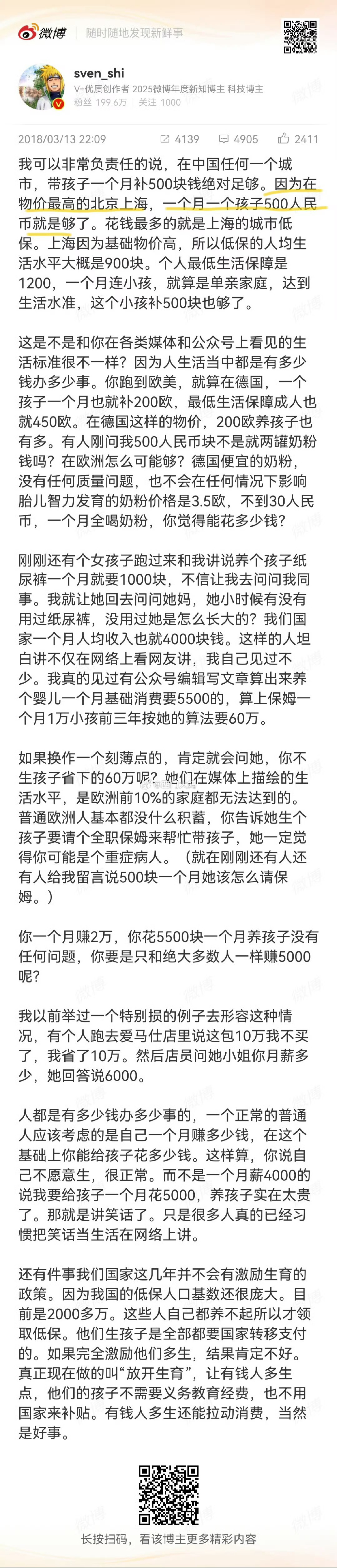 记录者 两个大V打架,我谁都不站队,但得说明一点——斯文说的500元够了,我觉得是不够的,光便宜奶粉钱一个月都不够,问题是谁愿意让孩子吃便宜的令人害怕的奶粉呢……这里是中国另一个话题争论,关于上海之前户口随母政策,是两个大V打架的起源,我这里说一下,斯文说的是真的,上海是经历过“原则上随母登记”到“随父随母自愿”的转变。上海这地方嘛,出台啥新政策新规定很正常,它有“吃螃蟹”的优先权嘛——哎,用官话说,是“先行先试优先权”,为了改革开放,上海是操碎了心的,比如2000年初出台的“蓝印户口”,沓的那个印子真的是蓝色的印章;比如那个“居转户”,持有居住证满7年等条件满足了可以申请迁入沪籍,也是比较好的政策。