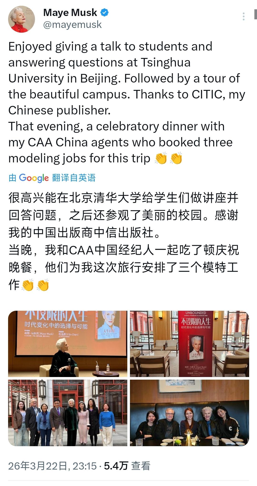 梅耶·马斯克昨晚(3月22日晚)写道:“很高兴能在北京清华大学给学生们做讲座并回答问题,之后还参观了美丽的校园。感谢我的中国出版商中信出版社。当晚,我和CAA中国经纪人一起吃了顿庆祝晚餐,他们为我这次旅行安排了三个模特工作。” [机智]评几句:梅耶·马斯克看起来比她的儿子更爱中国。梅耶·马斯克的人生堪称逆袭传奇,1948年生于加拿大,两岁随父母移居南非,15岁开启模特生涯并入围南非小姐决赛,却在22岁步入不幸婚姻,历经9年家暴后31岁毅然离婚,净身出户带着三个孩子远赴加拿大,日子清贫到打5份工糊口,仍咬牙拿下两个营养学硕士学位。她辗转加、美、南非三国打拼,40多岁为孩子多次重启事业,60岁重返模特舞台,银发造型成独特标志,67岁登纽约时装周,74岁创下《体育画报》泳装特刊最年长封面模特纪录,还登上时代广场四块广告牌。她不仅是顶尖模特、资深营养师,更培养出三个出色子女,70多岁仍活跃在时尚与专业领域,著有自传《未设限的人生》,用一生打破年龄与困境的枷锁,活成了不惧重来、永远向上的硬核女性。