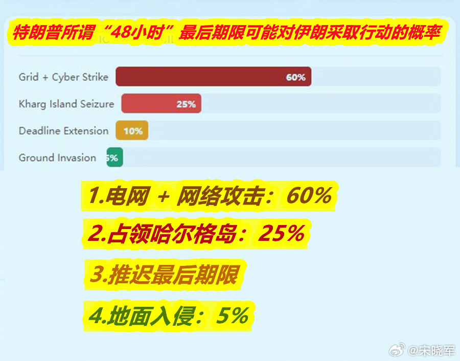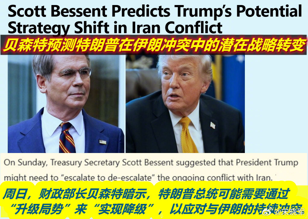 对战事进入第四周现状及发展趋势最简洁的表述——图1:美财长说特朗普要对伊朗玩“以升级促降级”;图2:随后美伊双方就开始隔空强硬喊话;图3:接下来就看特朗普在四个选项中咋选了(猜猜看)?图4:当然,特朗普要是不敢选“狠招儿”,概率最大的就是“消耗战僵局”。至于打的最大可能炸伊朗电网,是用CBU-94+BLU-114/B还是"战斧"Kit-2齐射,就交给爱谈枪长炮短的“大妈军事”了。注意:枪长炮短也要谈的精致专业哦。